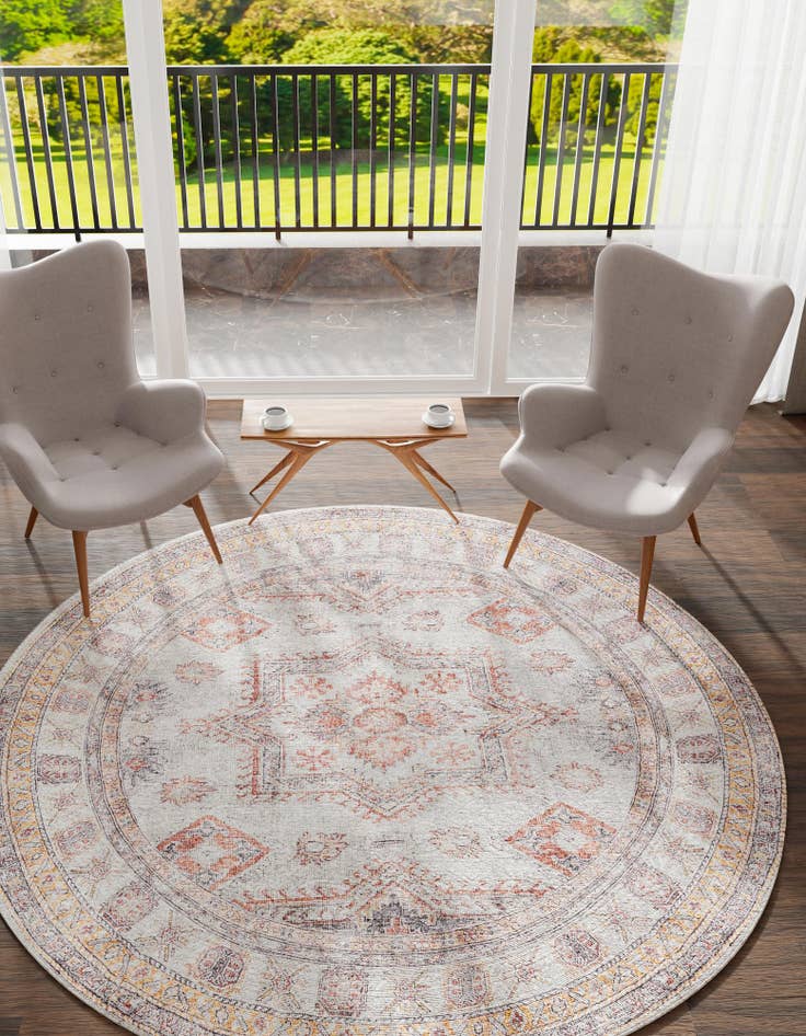 A 7' 10 round ivory traditional rug with an intricate medallion pattern in shades of cream, rust, and grey.
