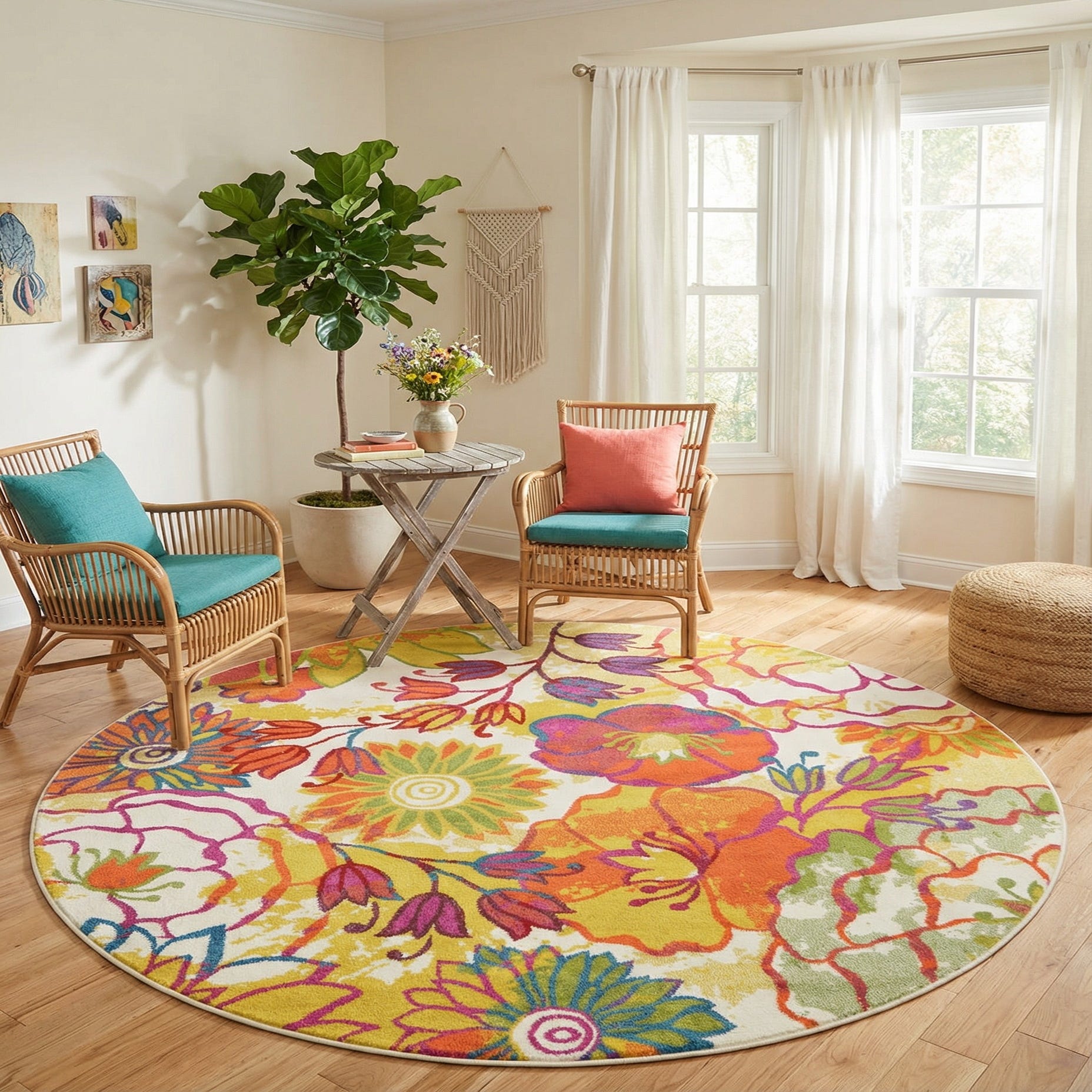 This round shape makes the rug an instant focal point for a sunny living room, a cozy breakfast nook or beneath a round dining table, and it brings an energetic pop to bedrooms, playrooms or casual sitting areas. Pair it with natural wood or rattan furniture for a relaxed, warm scheme, or use it to lift a neutral palette with colorful throw pillows and simple, modern accents for a fresh, collected look.