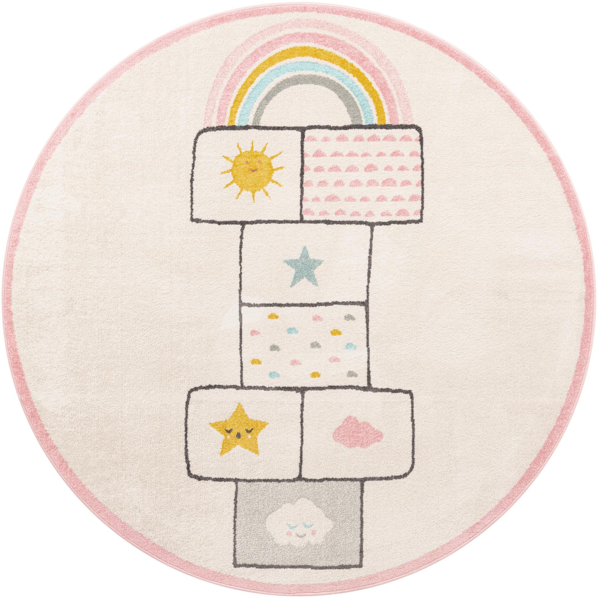 A round ivory rug with a playful hopscotch design featuring a rainbow, sun, stars, and clouds, bordered in pink.