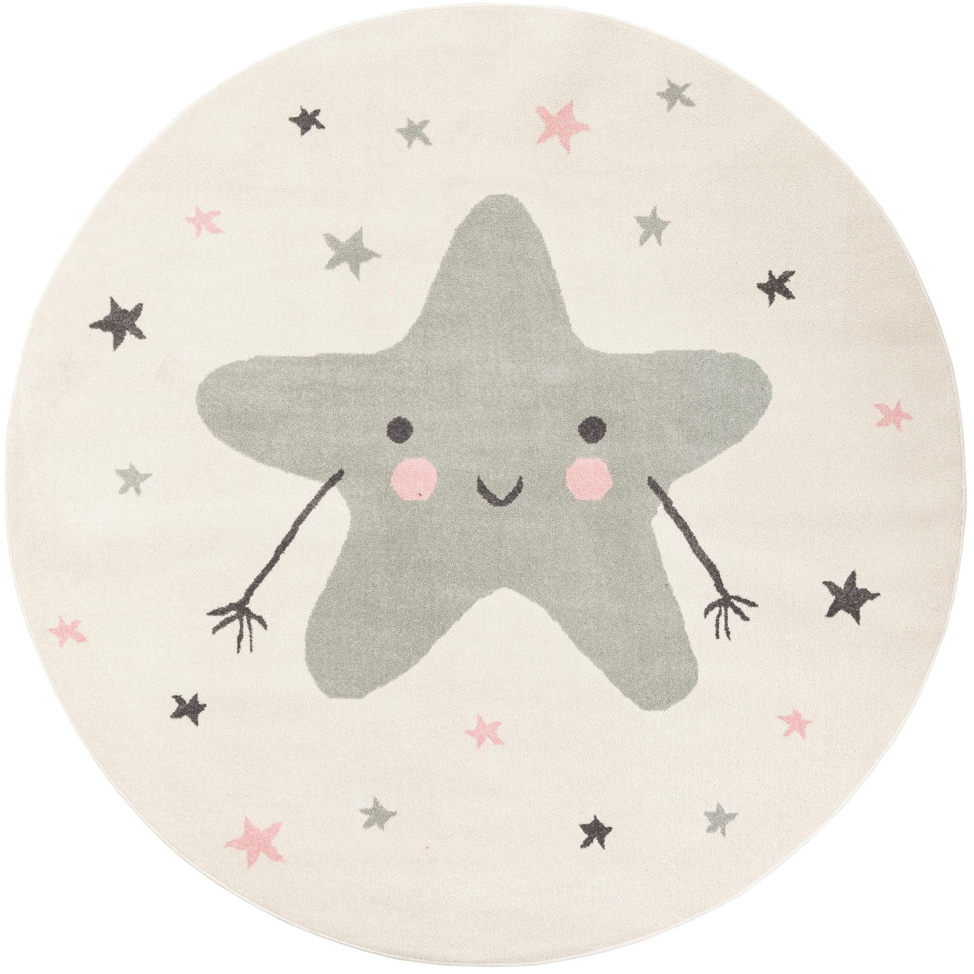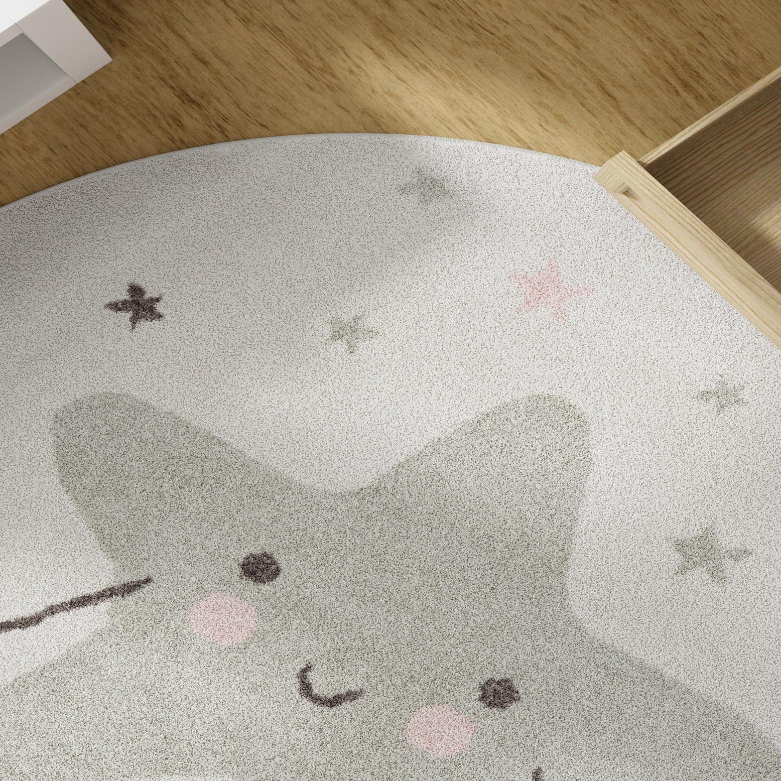 Round ivory rug with a large smiling grey star in the center, surrounded by smaller pink, grey, and black stars.