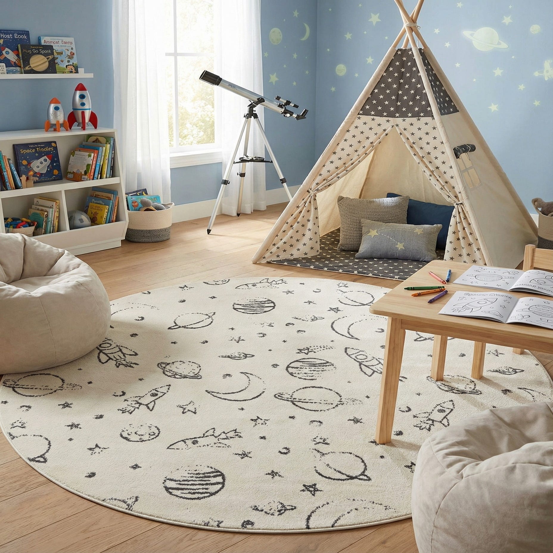 The simplicity in color and design allows this rug to harmonize with a variety of youthful decor themes, from space-inspired rooms to more minimalist child-friendly interiors. Its round shape can center a room or create a distinct play area within larger spaces. The Whimsy Kids rug provides an aesthetically pleasing and practical accent to spaces designed for play, learning, and growth.