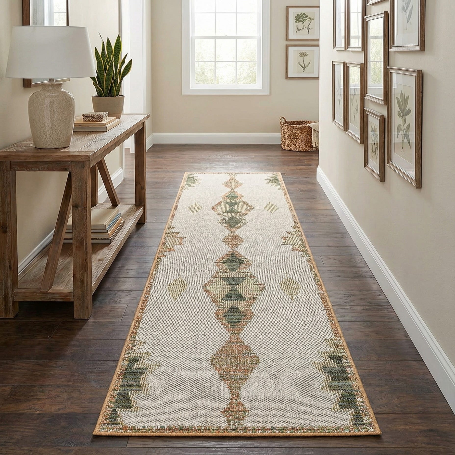 An 8 ft runner rug with a Southwestern tribal pattern in ivory, cream, and muted earth tones, ideal for a hallway or patio.