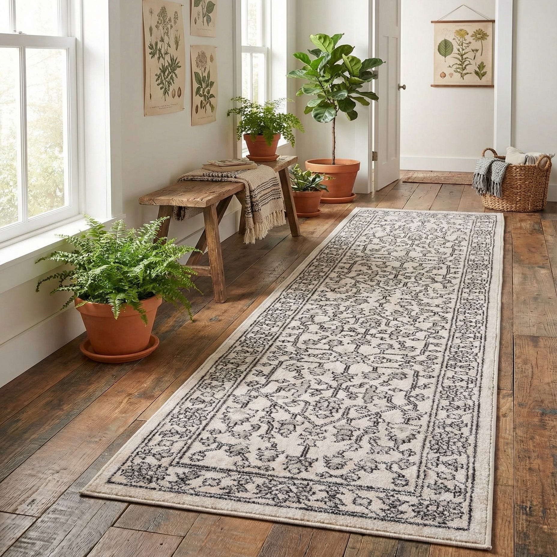 Designed for hallways, entryways, and narrow circulation spaces, this runner anchors traffic paths while keeping a neutral, timeless look. It pairs well with warm wood floors and transitional furnishings, complements a modern farmhouse or classic traditional scheme, and can introduce pattern into a minimalist or monochrome interior without overwhelming it.