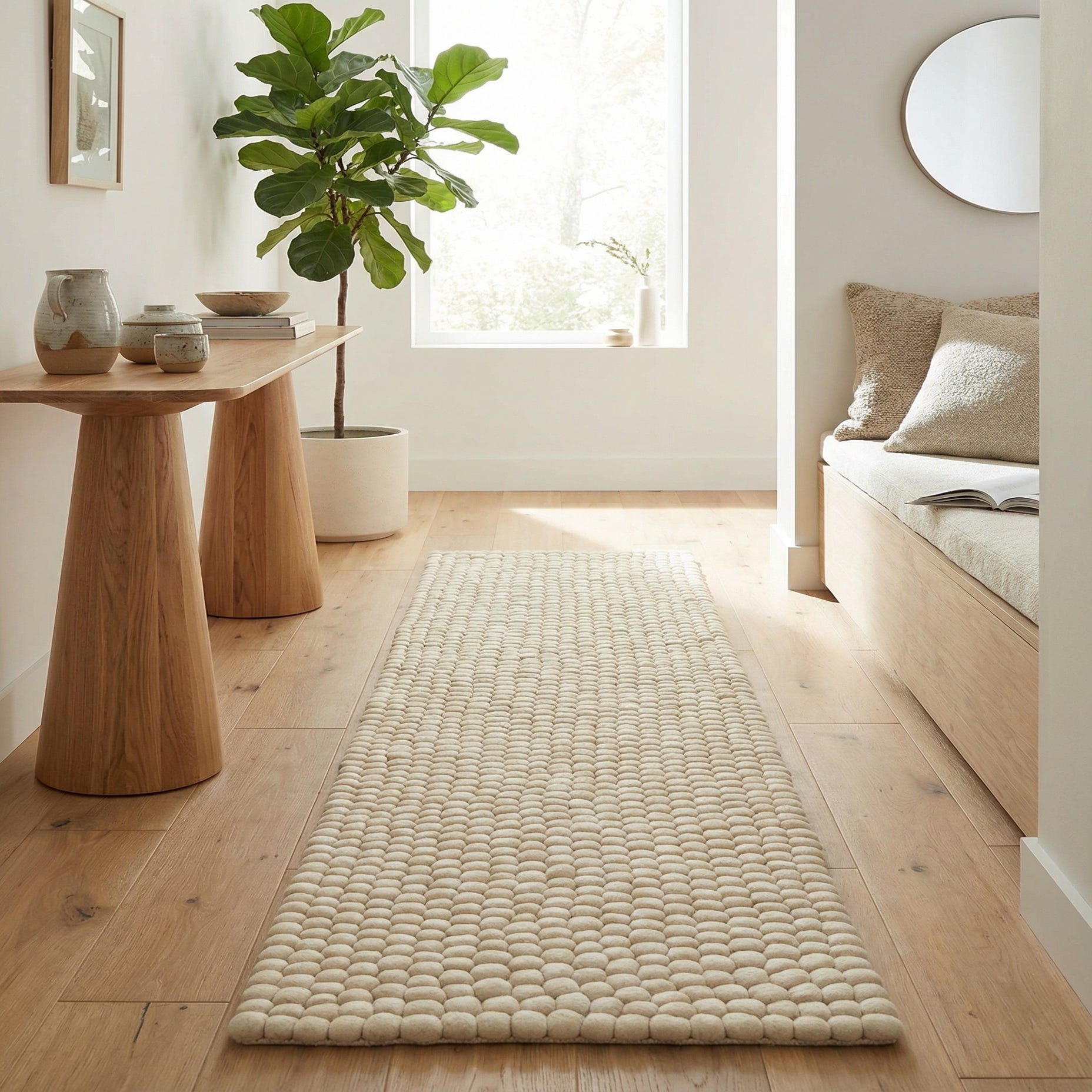 Hand-woven of 100% wool, this runner is built from tightly packed felted wool spheres that form a regular honeycomb-like pattern across an ivory field. The raised, pebble-like texture gives a soft, cushioned feel underfoot while the low, sculpted profile keeps the look refined. Because each felt ball is hand-placed, the surface has subtle depth and a tactile quality that invites touch.