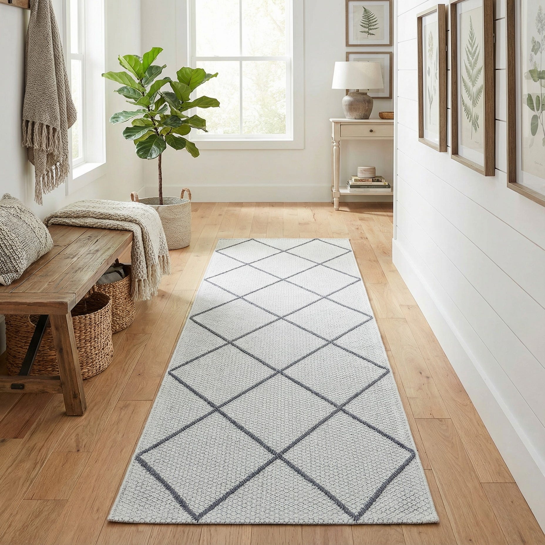This runner is well-suited for narrow spaces where you want to add pattern without overwhelming the room — think hallways, entryways, or alongside a bed. It pairs nicely with light- to mid-tone wood floors, neutral paint schemes, and furnishings in modern farmhouse, Scandinavian, coastal, or transitional interiors. Machine made from 100% cotton, it offers a casual, versatile foundation for layering rugs or anchoring simple, contemporary decorating schemes.