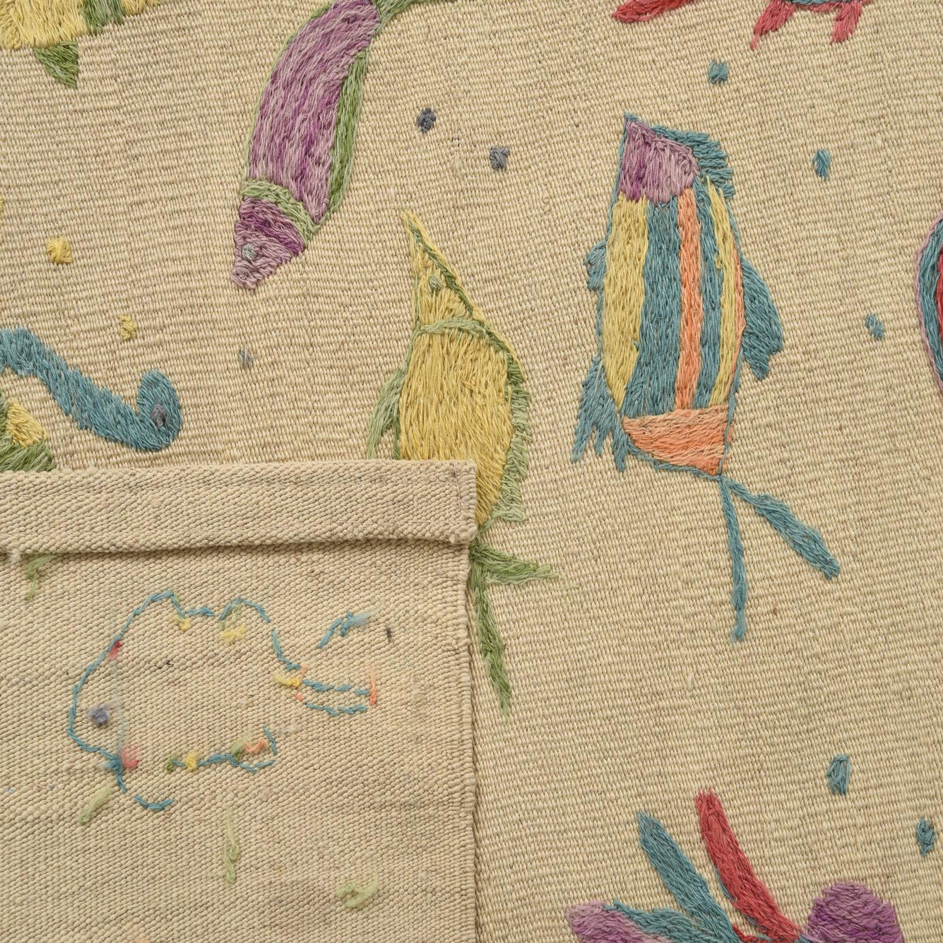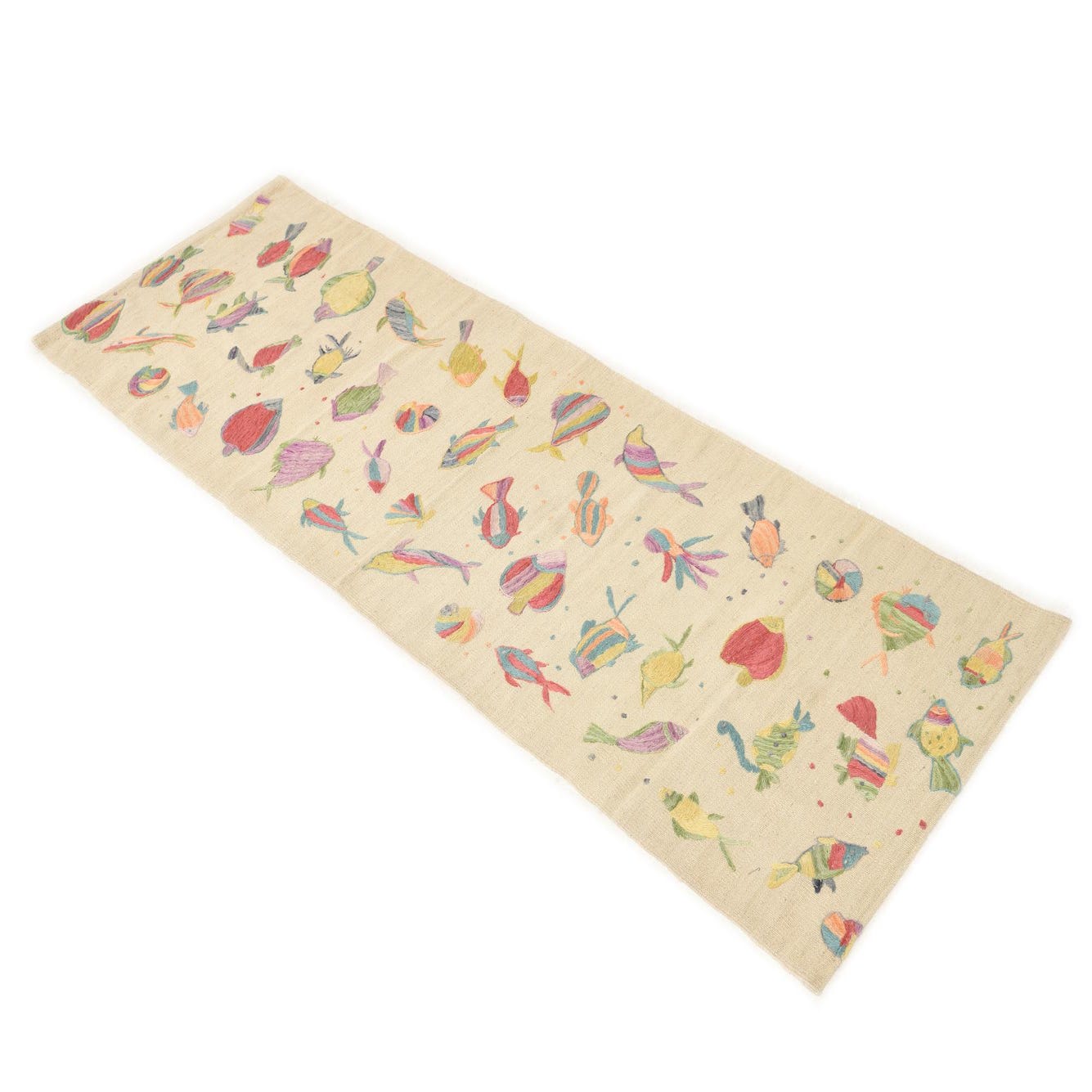 This rug's array of colors and the charming aquatic theme make it a compelling choice for spaces such as children's rooms, creative studios, or any area in need of a cheerful accent. Additionally, the rug's wool material and handcrafted quality ensure resilience and longevity, allowing for placement in high-traffic areas like hallways or living rooms. Its flatweave texture is easy to maintain and lies flush with the floor, ensuring a seamless integration into your design scheme.