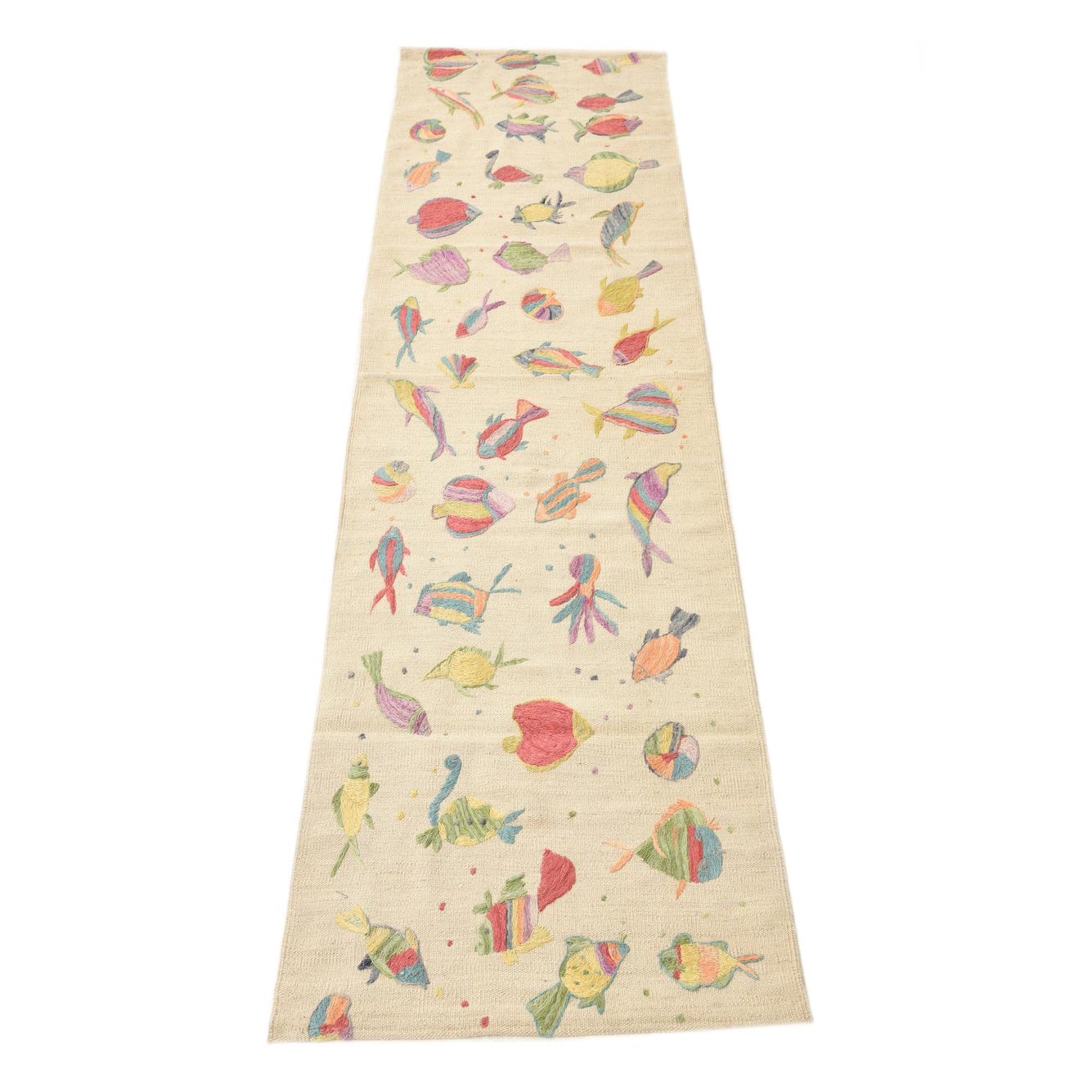 The Kilim Suzani collection presents a vibrant and whimsical 8 Ft Runner, handwoven of 100% wool, offering both durability and tactile pleasure. The rug features an engaging pattern of stylized fish, rendered in a lively palette that includes Ivory, Black, Blue, Brown, Navy Blue, Orange, Silver, Pink, and Violet on an inviting Ivory background. The playful, colorful imagery and the flatweave construction give the rug a casual, artisanal appearance, making it well-suited for a variety of interior spaces.