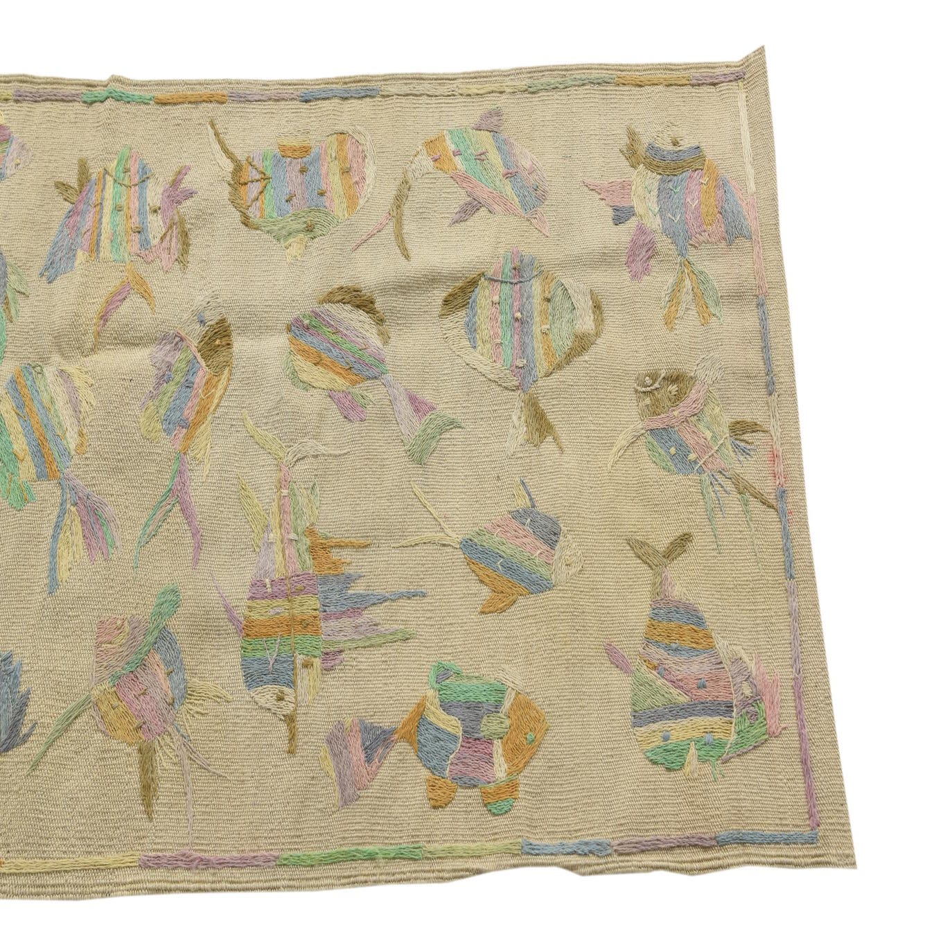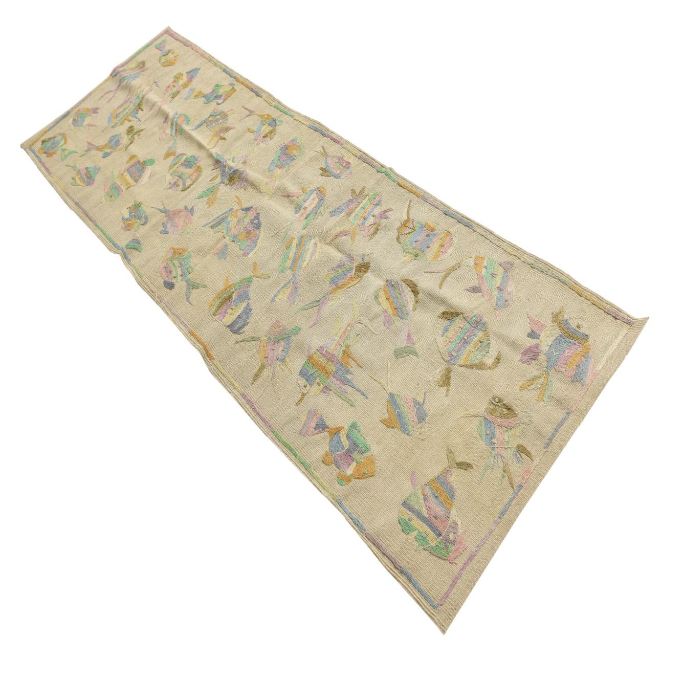 An 8 ft Kilim Suzani runner rug with a cream background and colorful, abstract fish patterns, perfect for a hallway or kitchen.