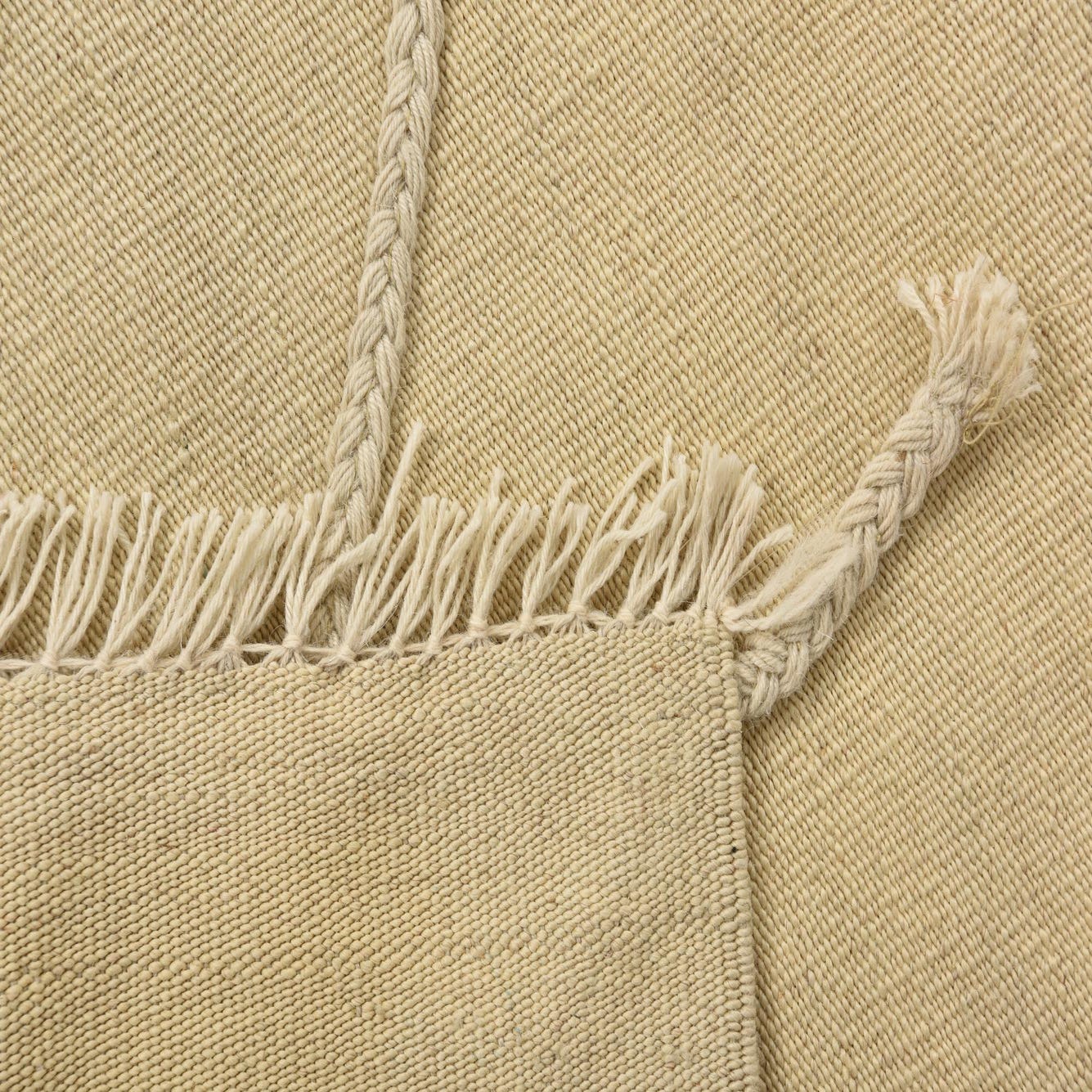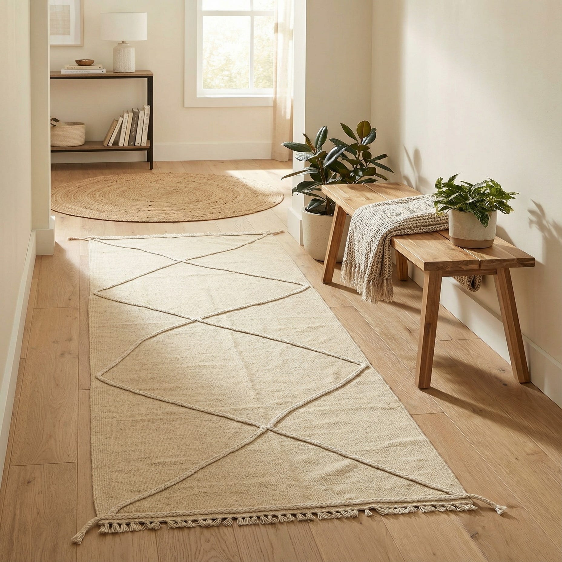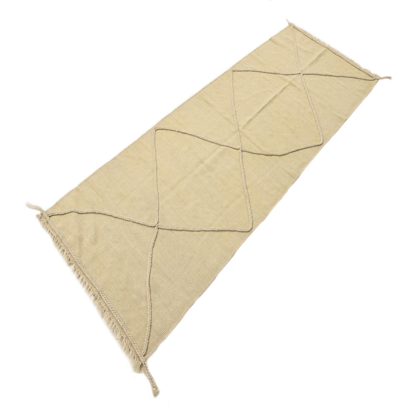 An 8 ft ivory wool runner rug with a raised white braided diamond pattern and fringed ends, ideal for a hallway.