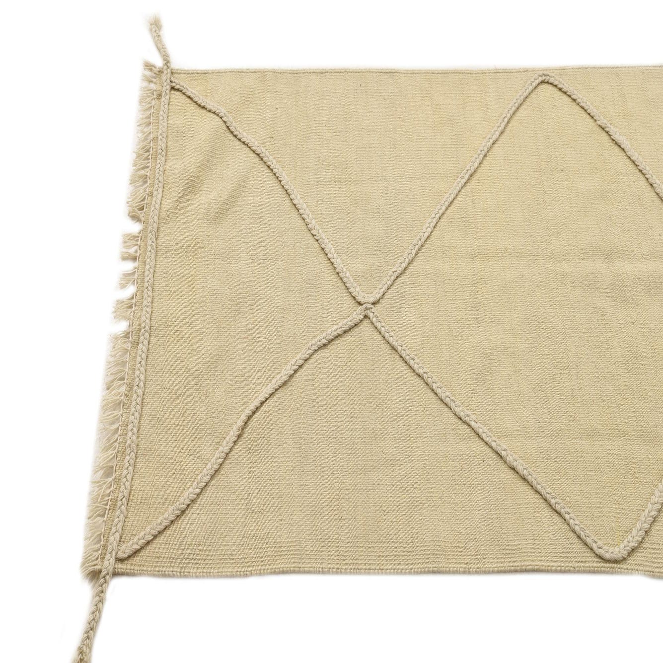 The design features an understated pattern with a distinctly Moroccan influence, showcasing a series of diamond-shaped motifs in a subtle relief against the ivory background. The geometric symmetry of the pattern adds a sense of balance and sophistication to the piece. A complementary fringe detail adds to its artisanal appeal, enhancing the rug's tactile and visual interest.
