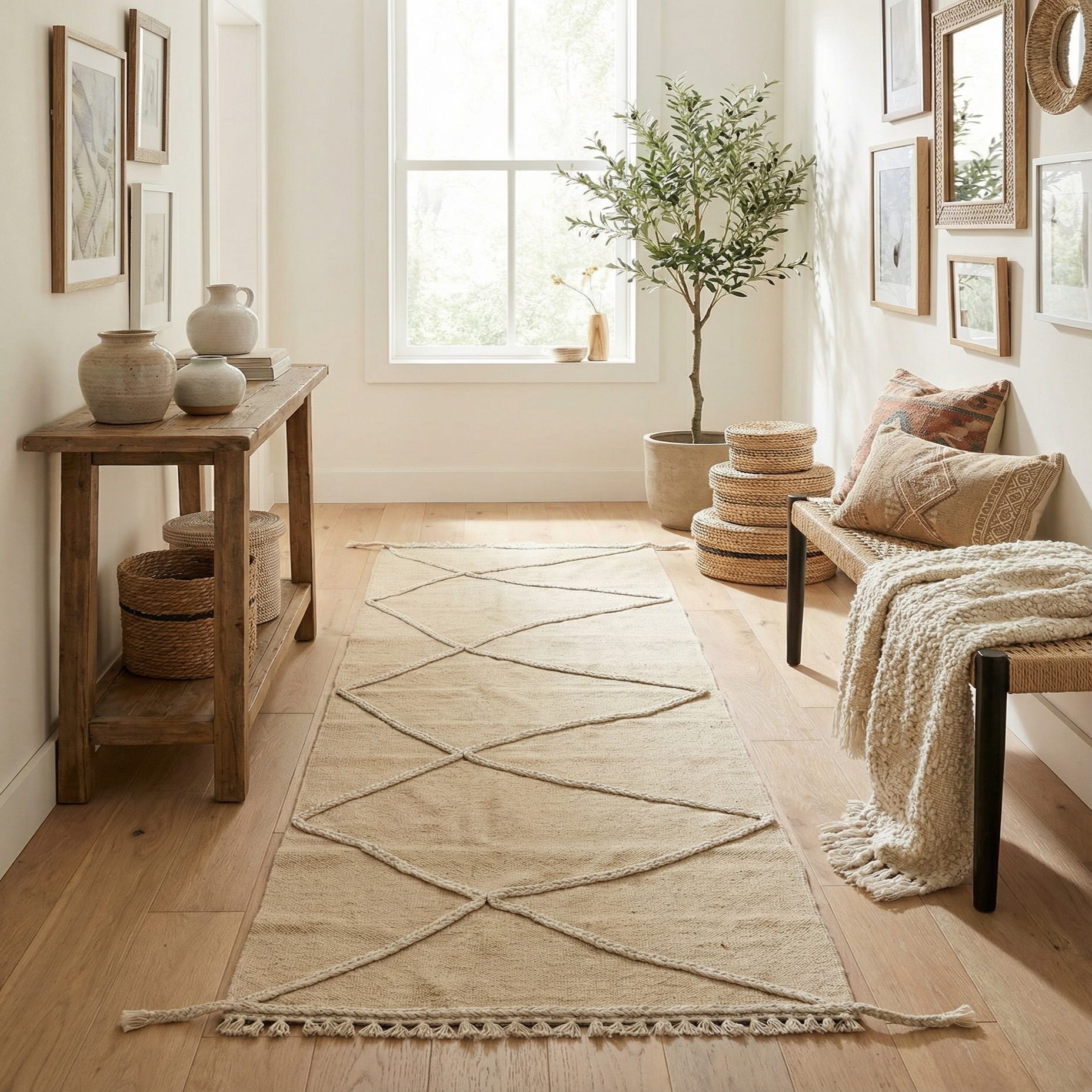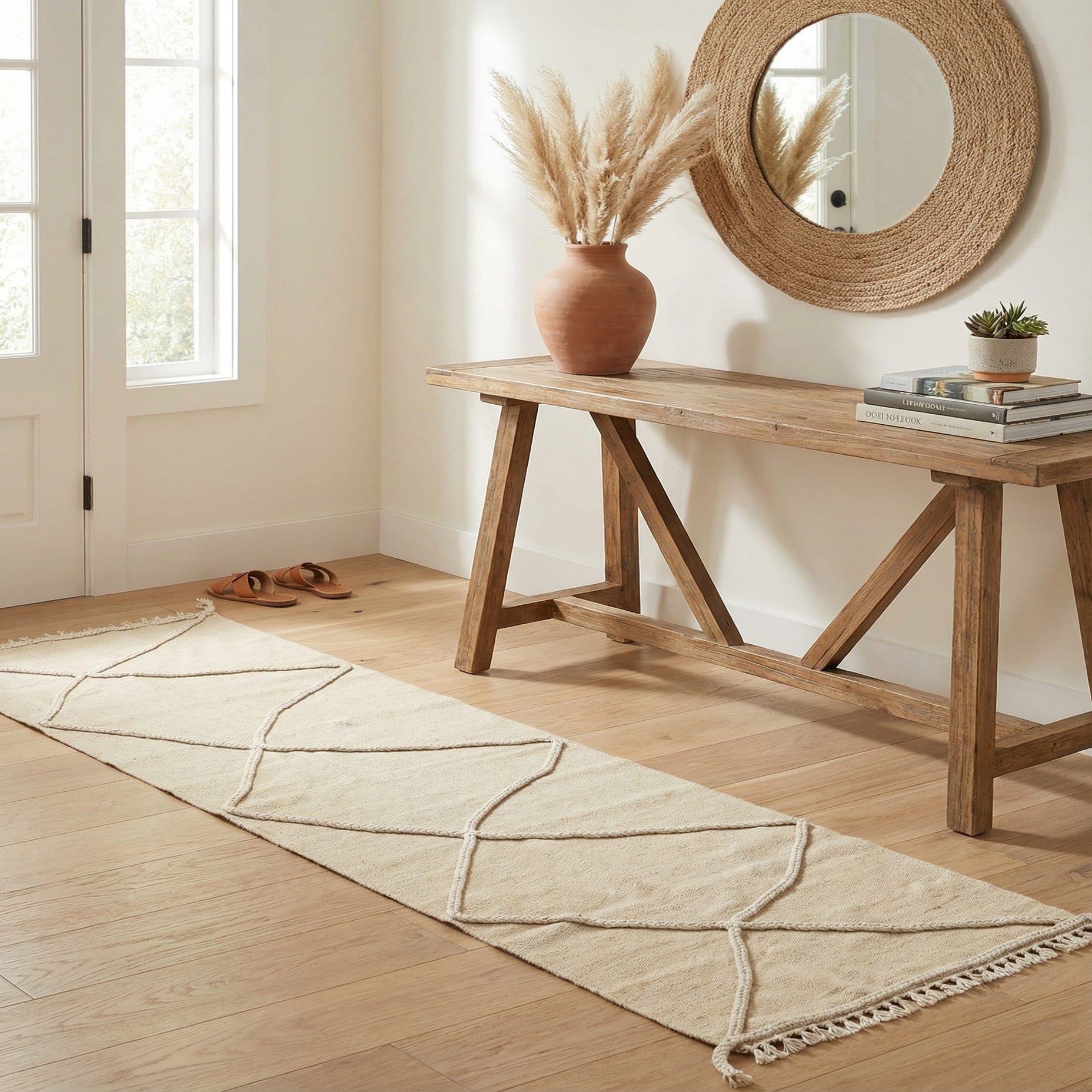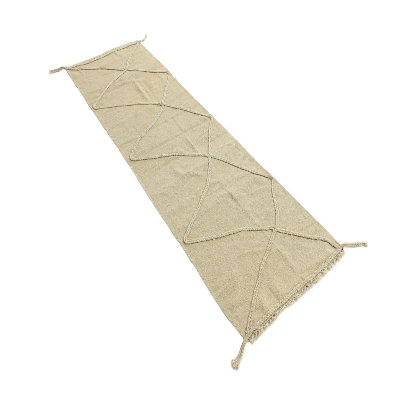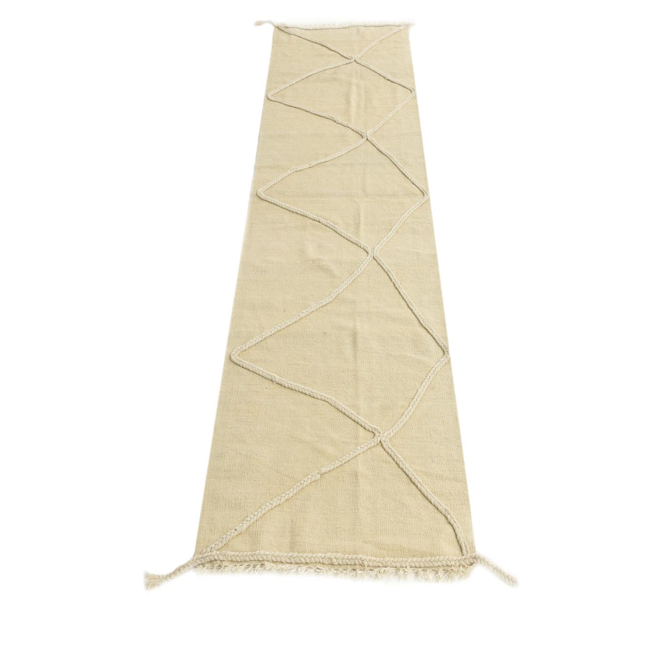 An 8 ft ivory wool runner rug with a raised white braided diamond pattern and braided tassels.