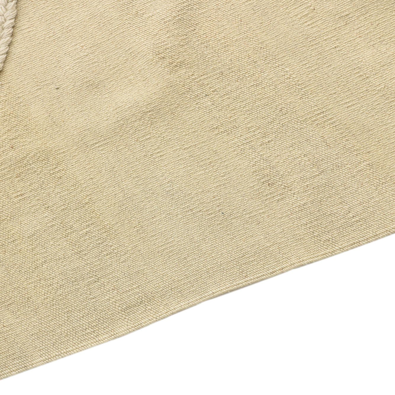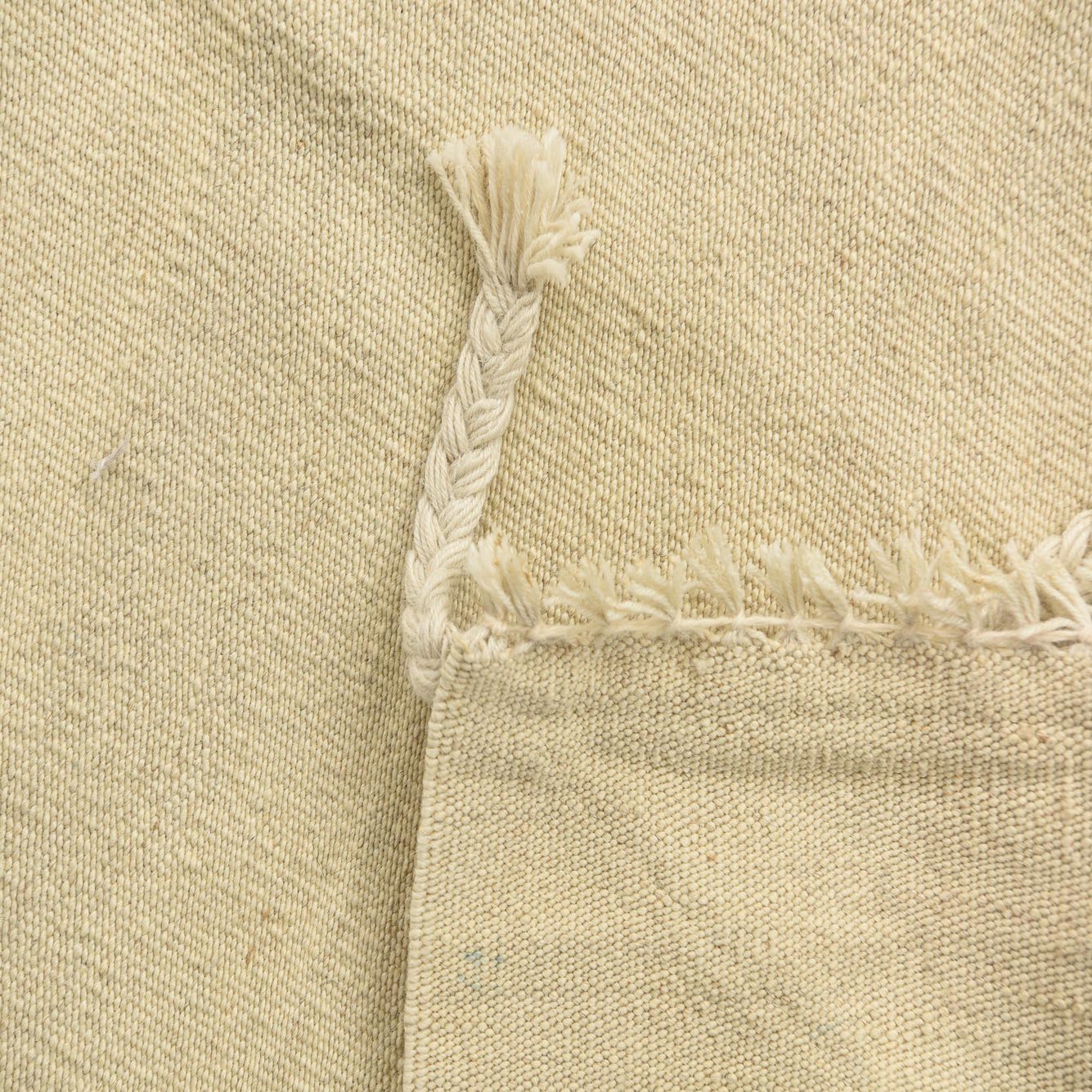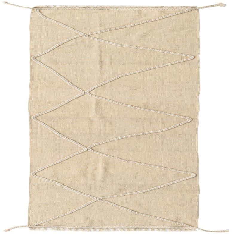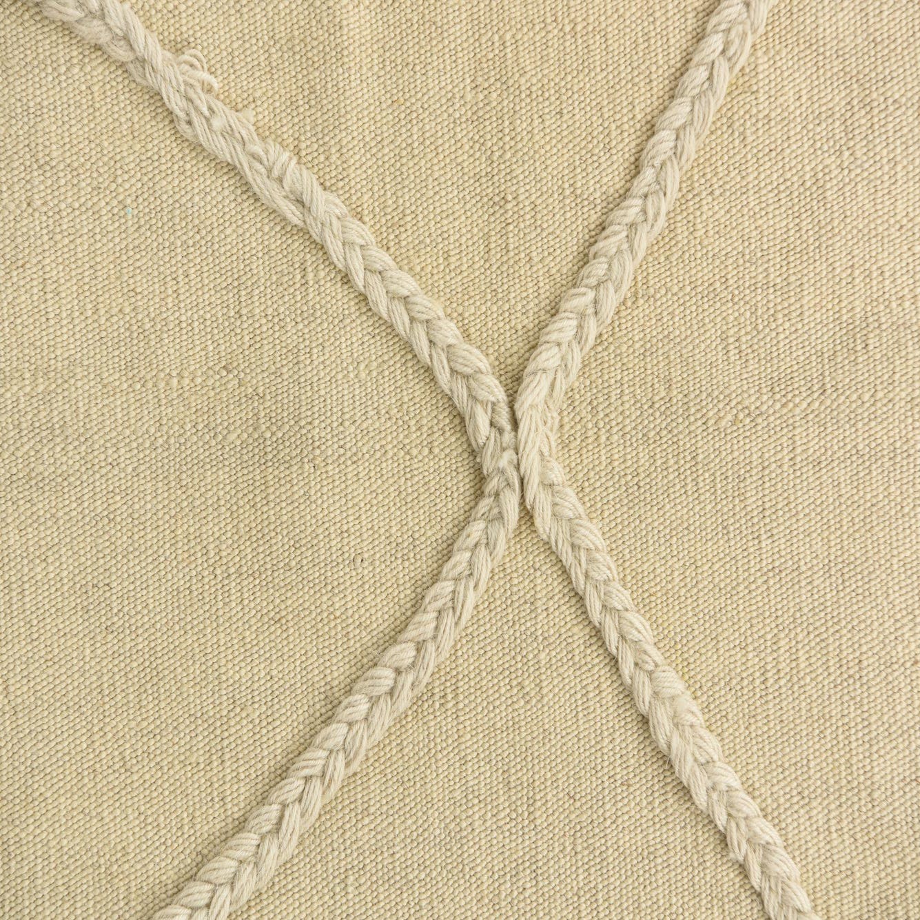 An 8 ft ivory wool runner rug with a raised white braided diamond pattern and braided tassels.