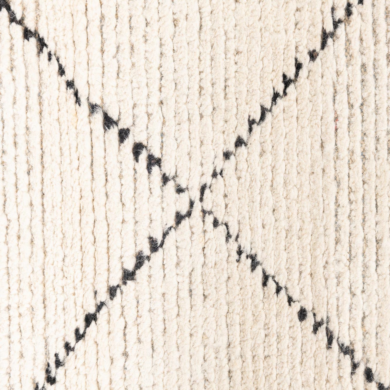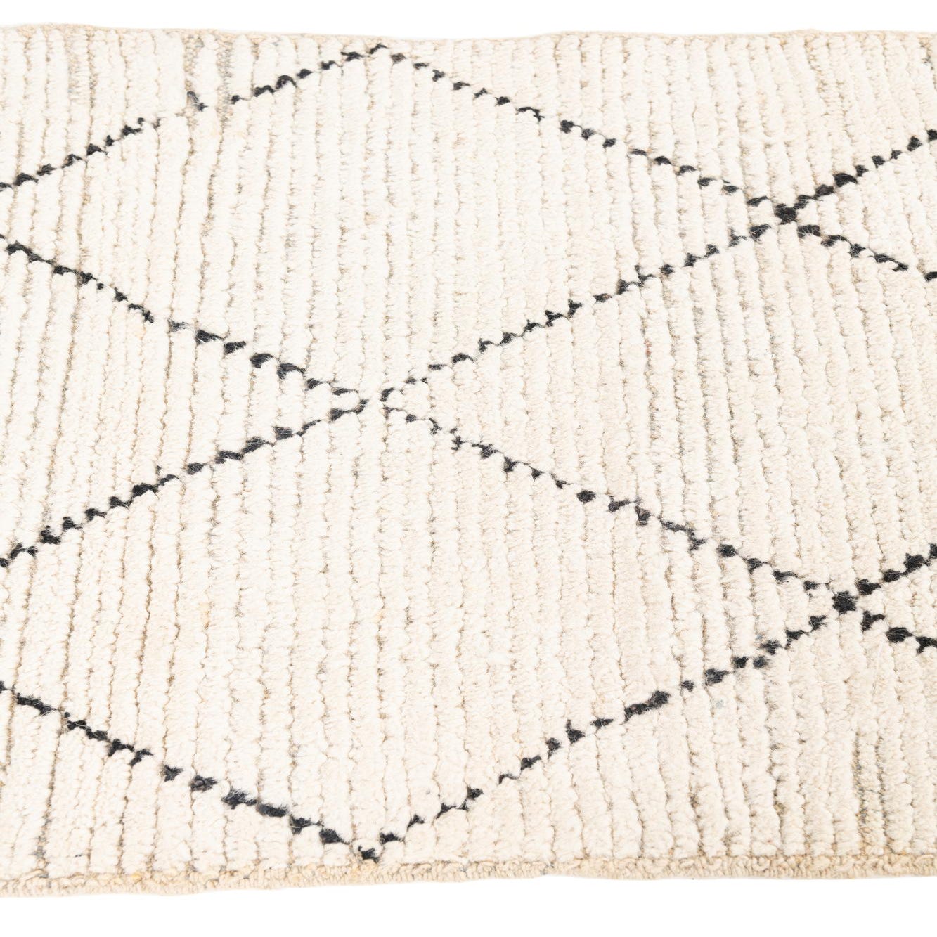 An 8 ft runner rug from the Moroccan collection, featuring an ivory shag pile with a black tribal diamond pattern, ideal for a hallway.