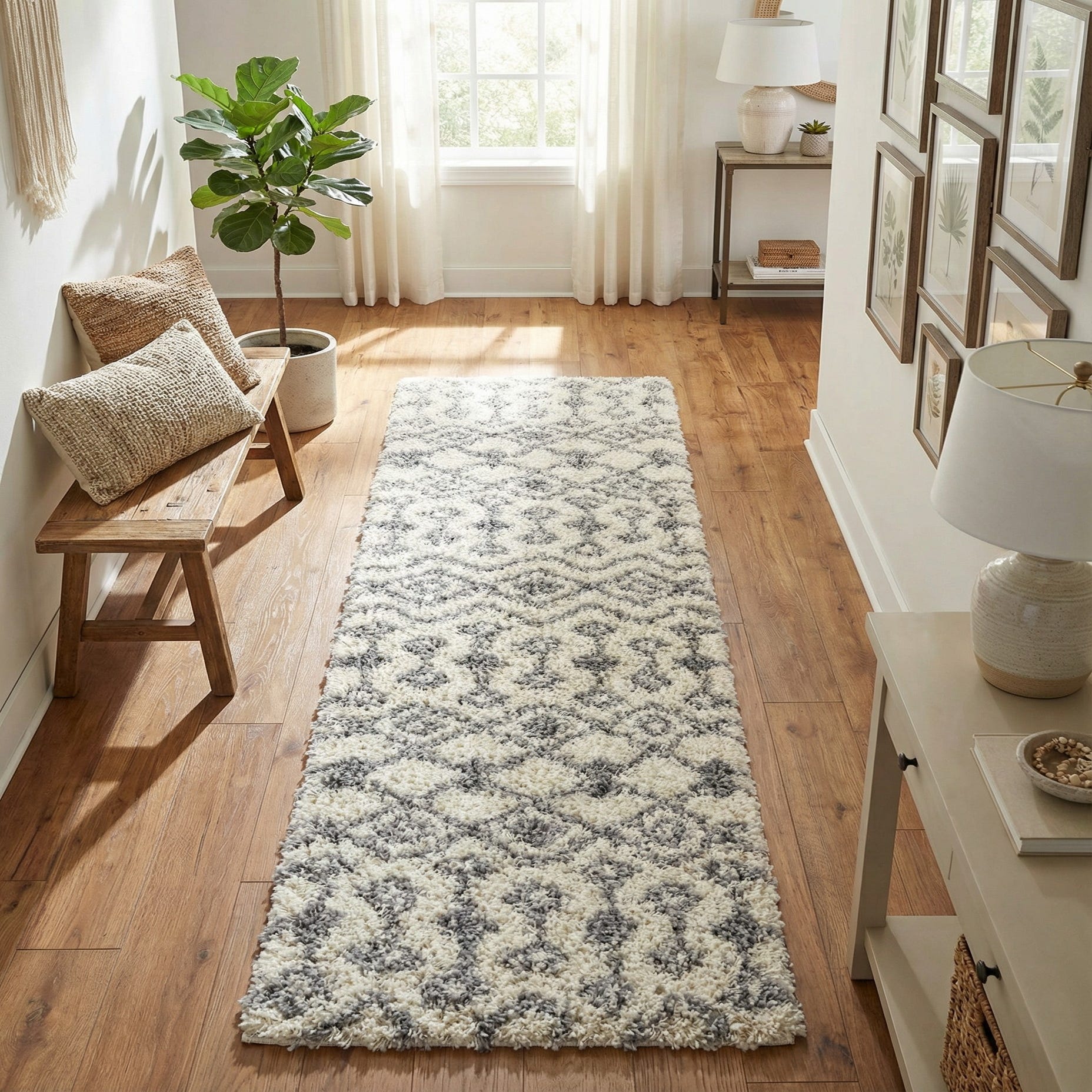 This runner fits well in transitional, modern farmhouse, or Scandinavian interiors where a mix of texture and calm color is needed. Use it to define a hallway, an entry, or the side of a bed; it also complements light wood floors, neutral upholstery, and metal accents in matte black or brushed nickel. Layer it with woven rugs or pair with simple, clean-lined furniture to balance the pile and pattern.
