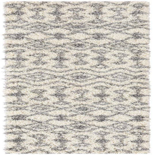 An 8 ft runner rug with a thick shag pile, featuring a modern tribal pattern in ivory and gray.