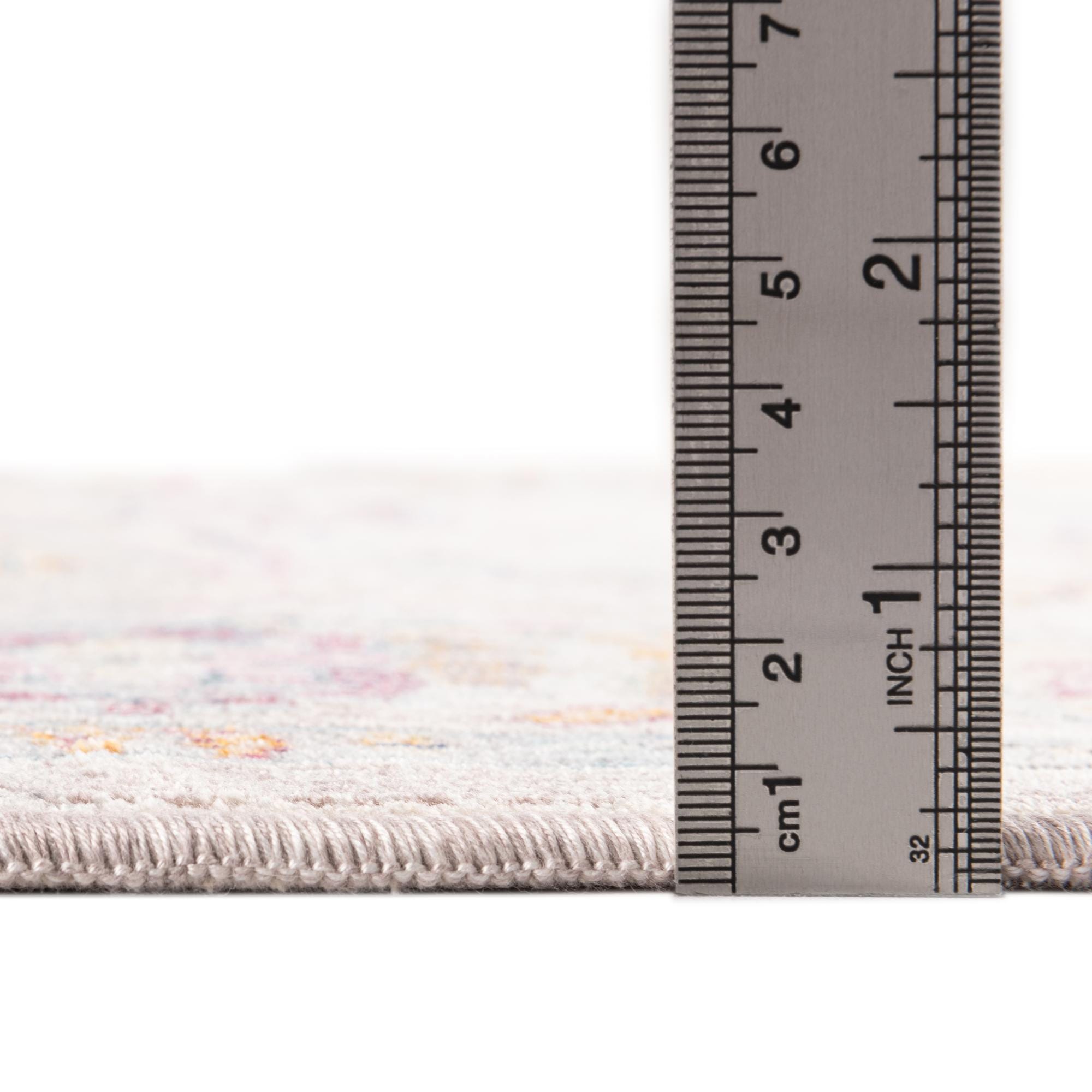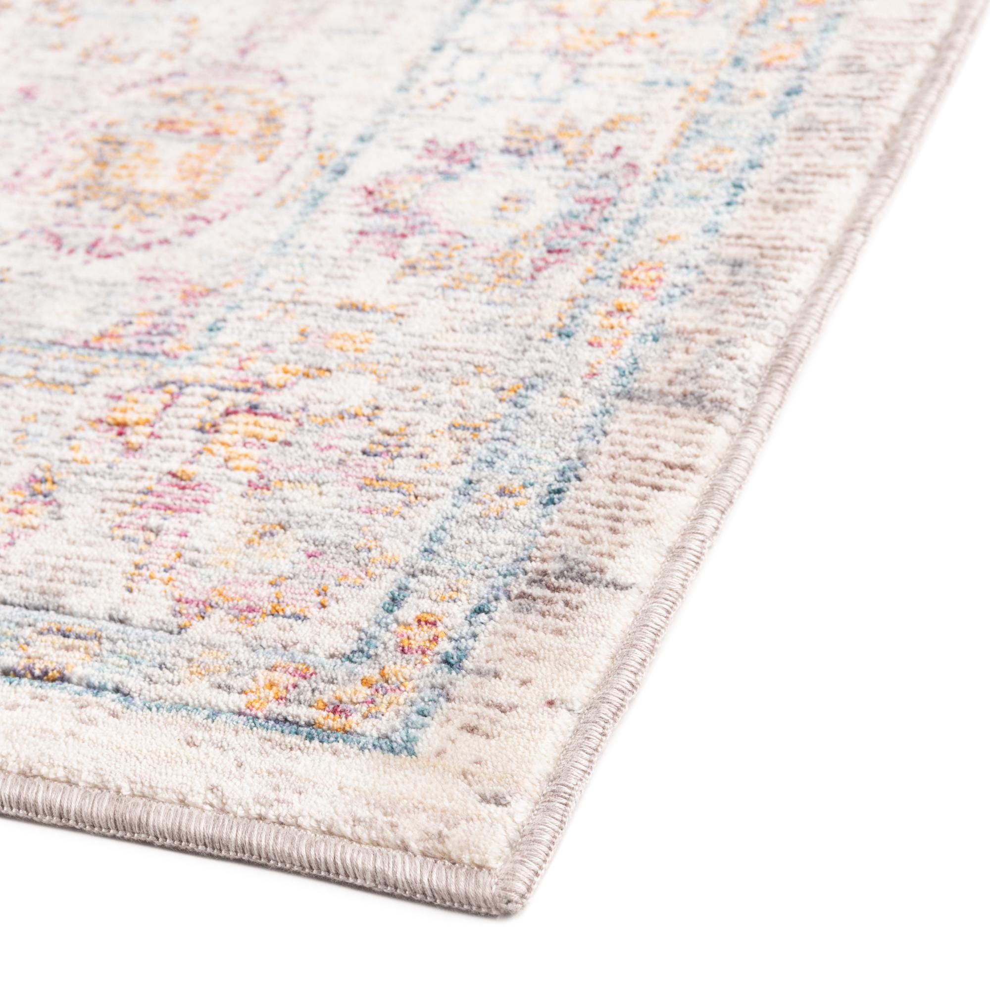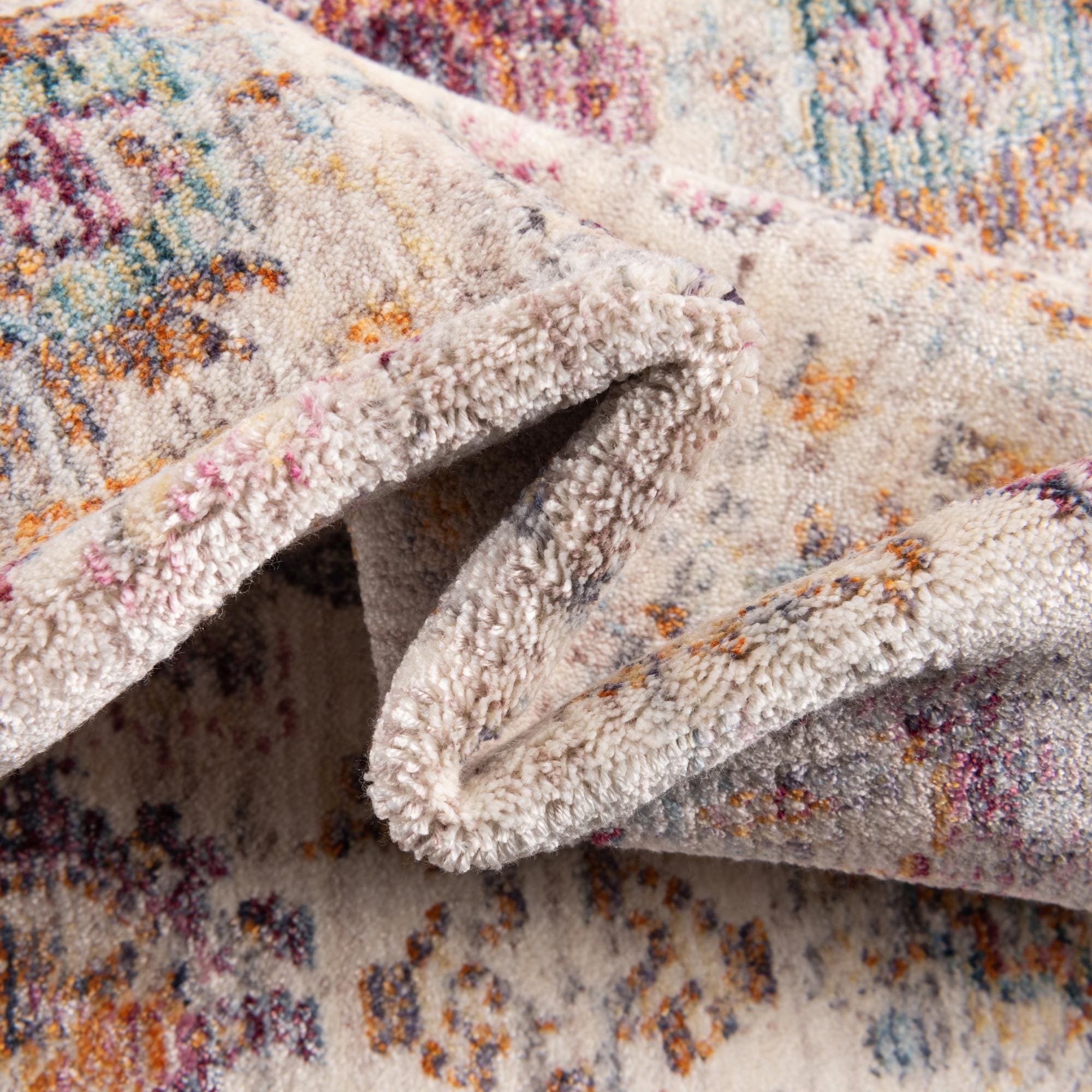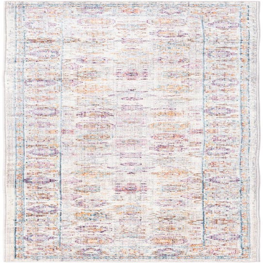 Primary color is Ivory. Colors in this rug include: Ivory, Blue, Gray, Green, Light Blue, Orange, Purple, Pink, Yellow.