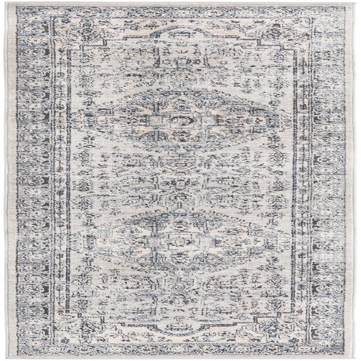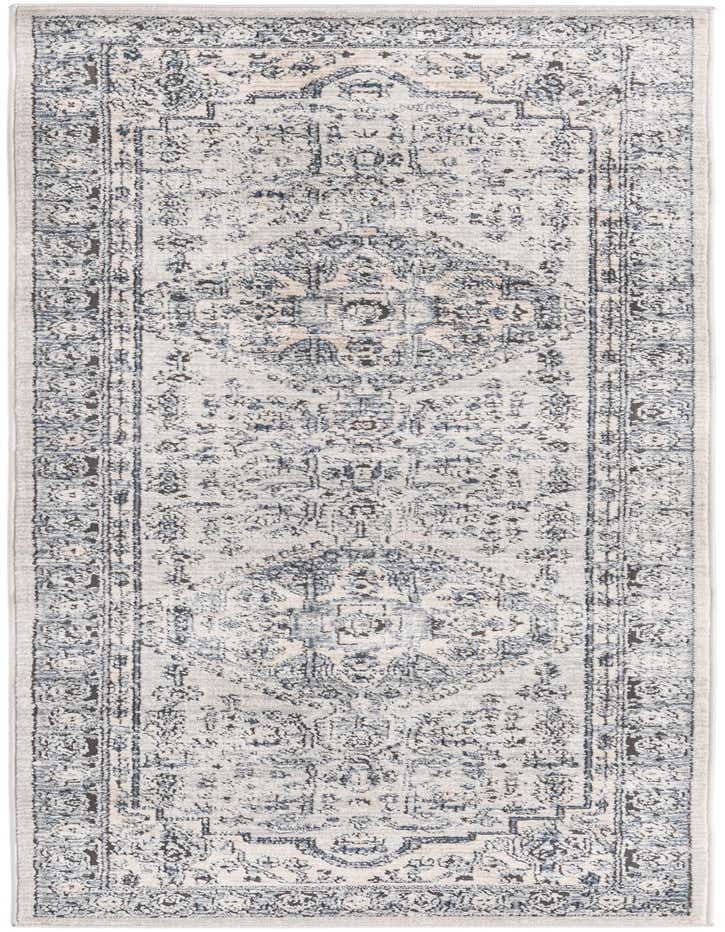 Primary color is Ivory. Colors in this rug include: Ivory, Gray, Light Blue.