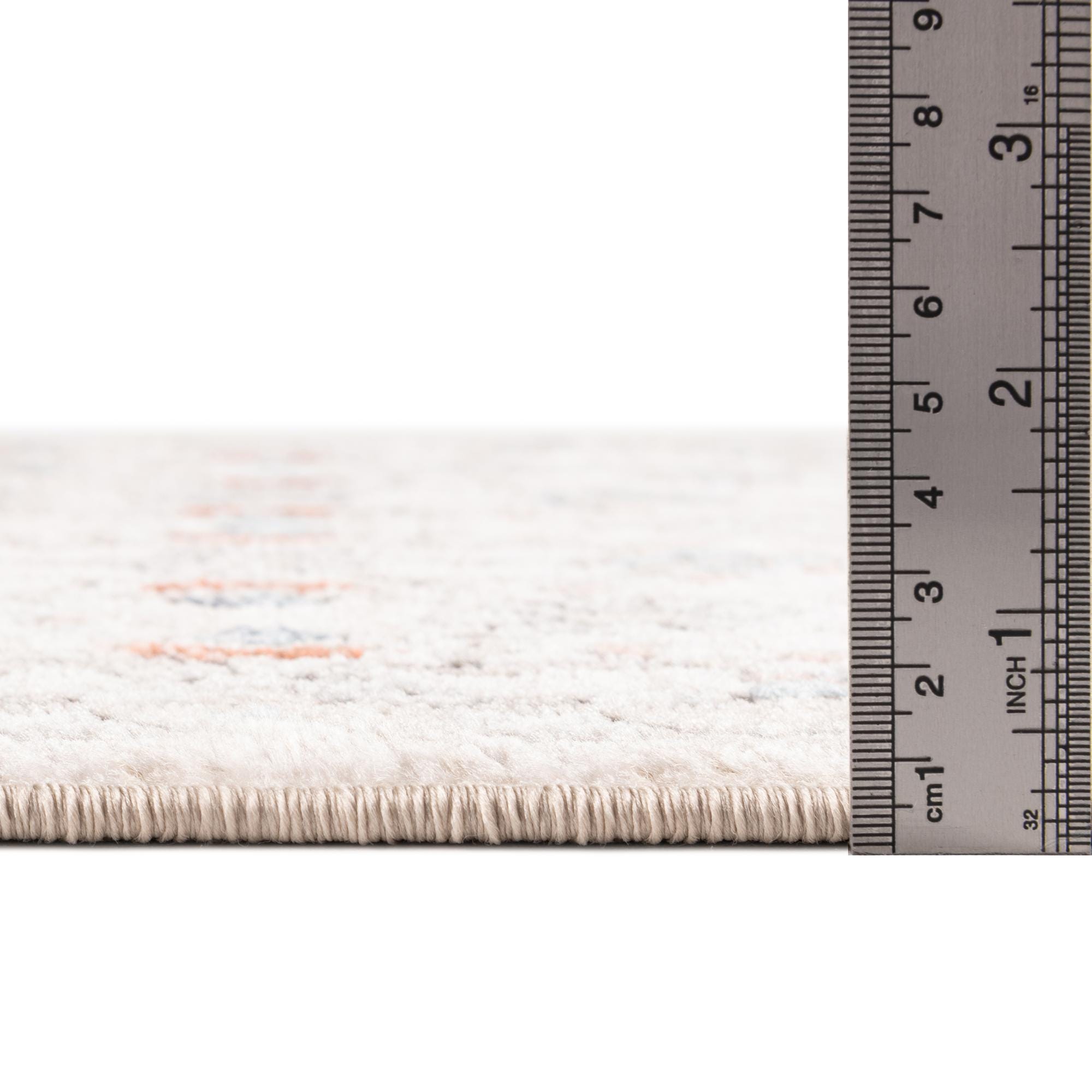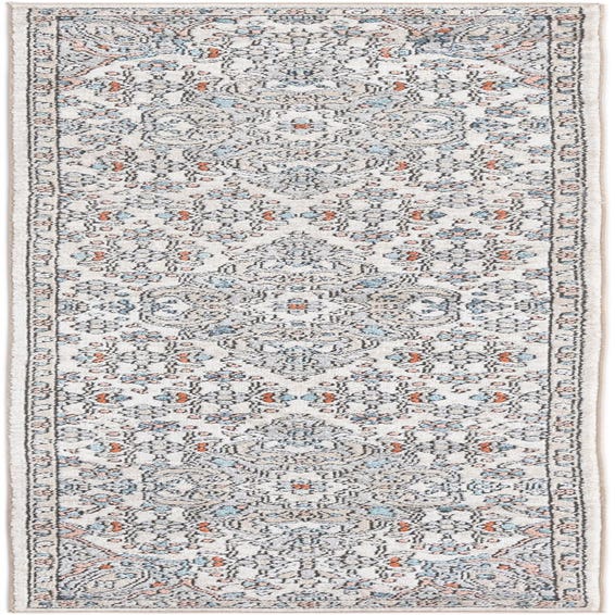 Primary color is Ivory. Colors in this rug include: Ivory, Blue, Gray, Light Blue, Rust Red.