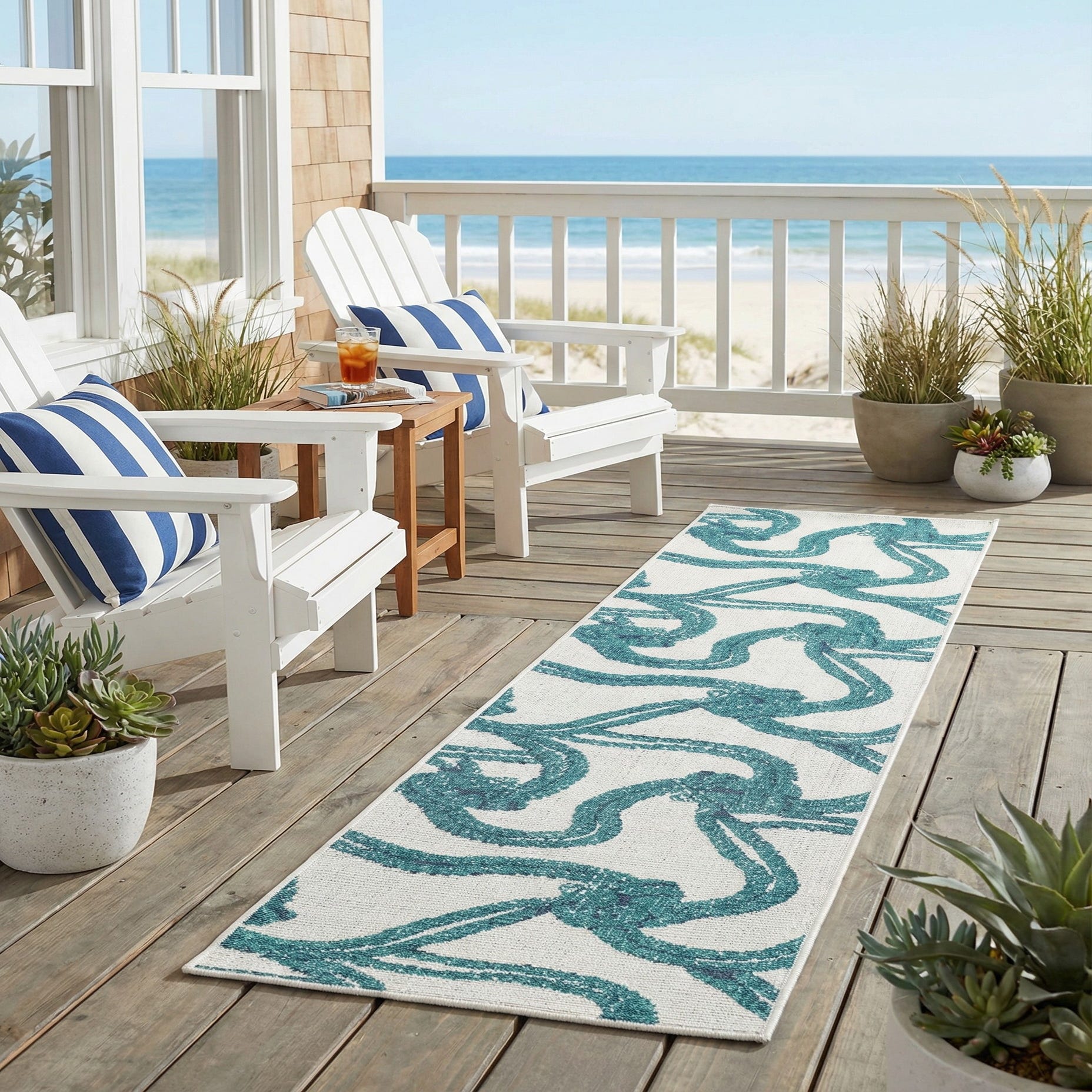This Outdoor Coastal Collection 8 Ft Runner rug exhibits a dynamic and free-flowing pattern reminiscent of oceanic movements. Fashioned from 100% polypropylene, this machine-woven runner is both durable and practical, appropriate for high-traffic areas. It has a versatile ivory background complemented by patterns in shades of blue and green, creating a visual that is both calming and inviting.