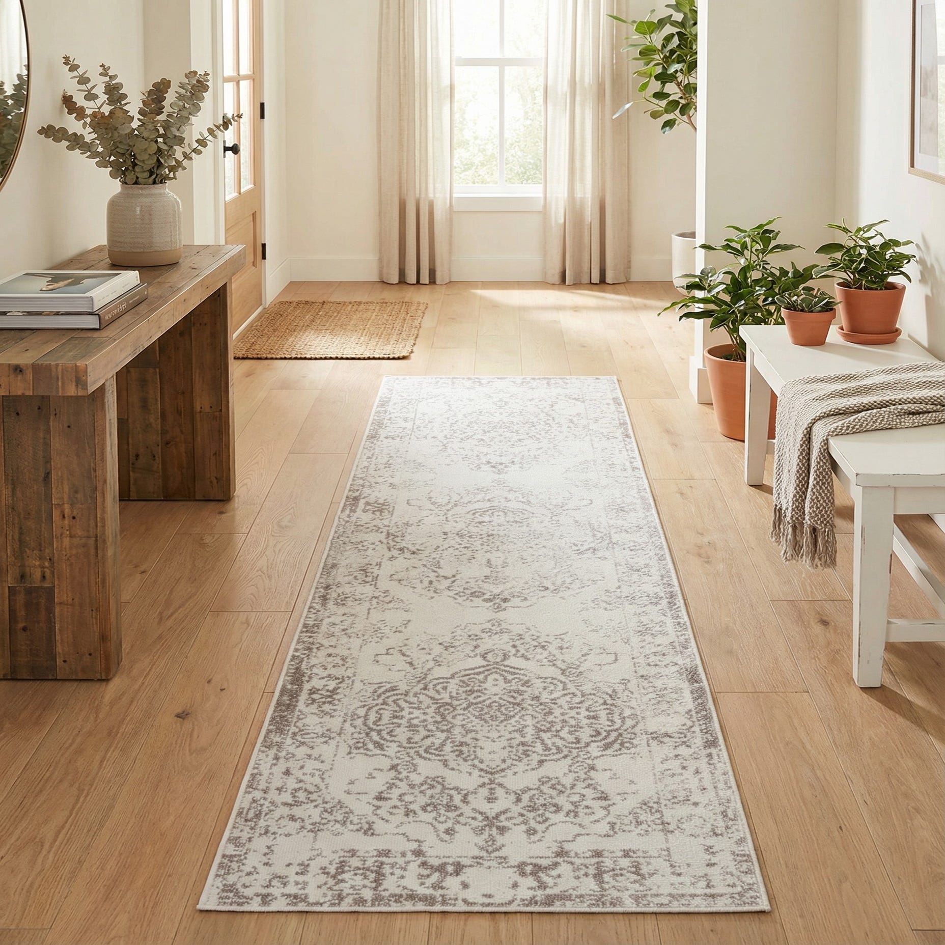 Sized as a runner, this piece works well in long, narrow areas where you want to add pattern without overwhelming the space. It pairs naturally with light wood floors, painted millwork and neutral upholstery in transitional, Scandinavian or modern farmhouse interiors, and it can also act as a calming counterpoint to bolder wall colors or patterned textiles. Use it in hallways, entryways, alongside beds or in galley kitchens to introduce texture and visual length while keeping the palette soft and cohesive.