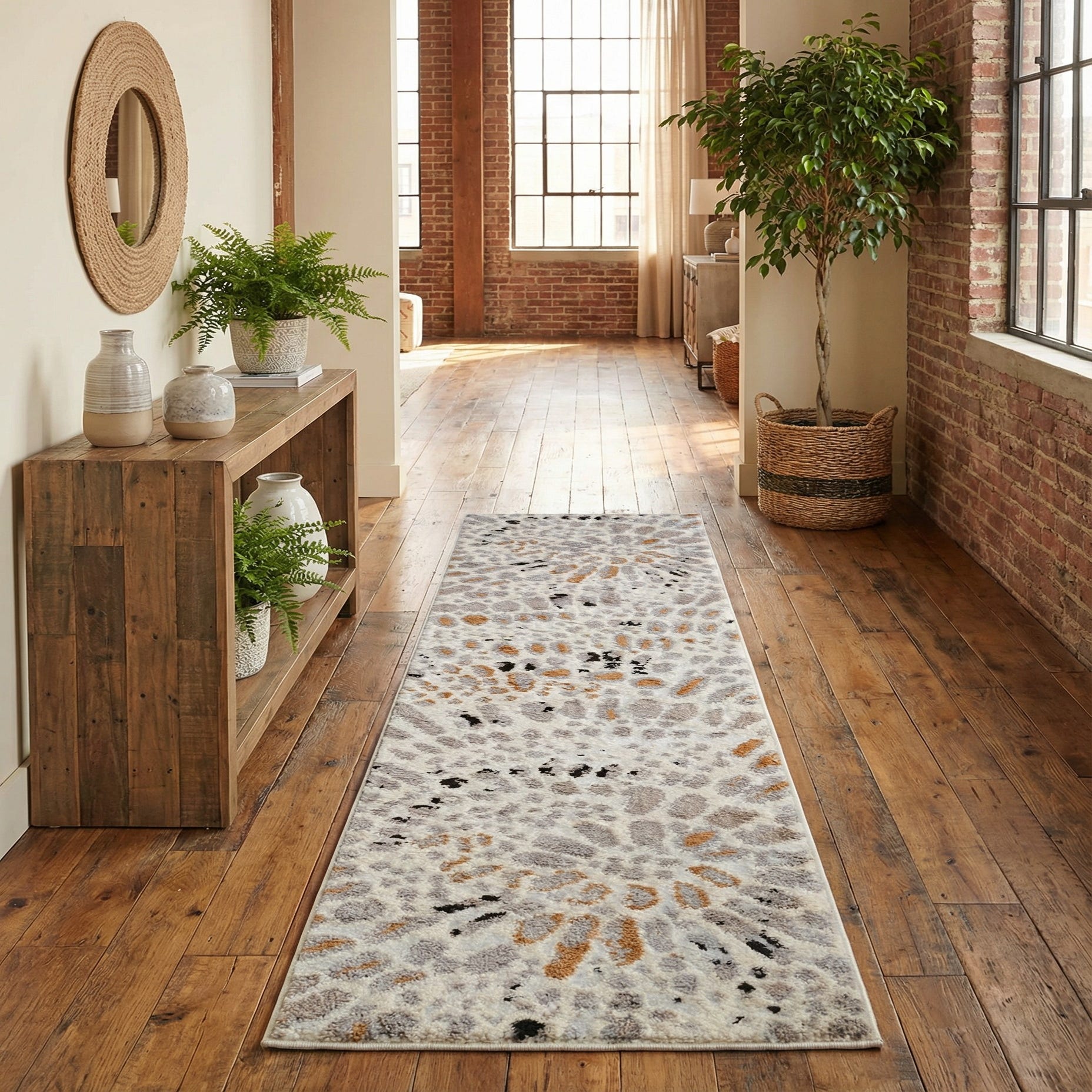 An 8 ft runner rug with an abstract, modern pattern in ivory, cream, gray, and subtle brown tones, featuring a textured pile.