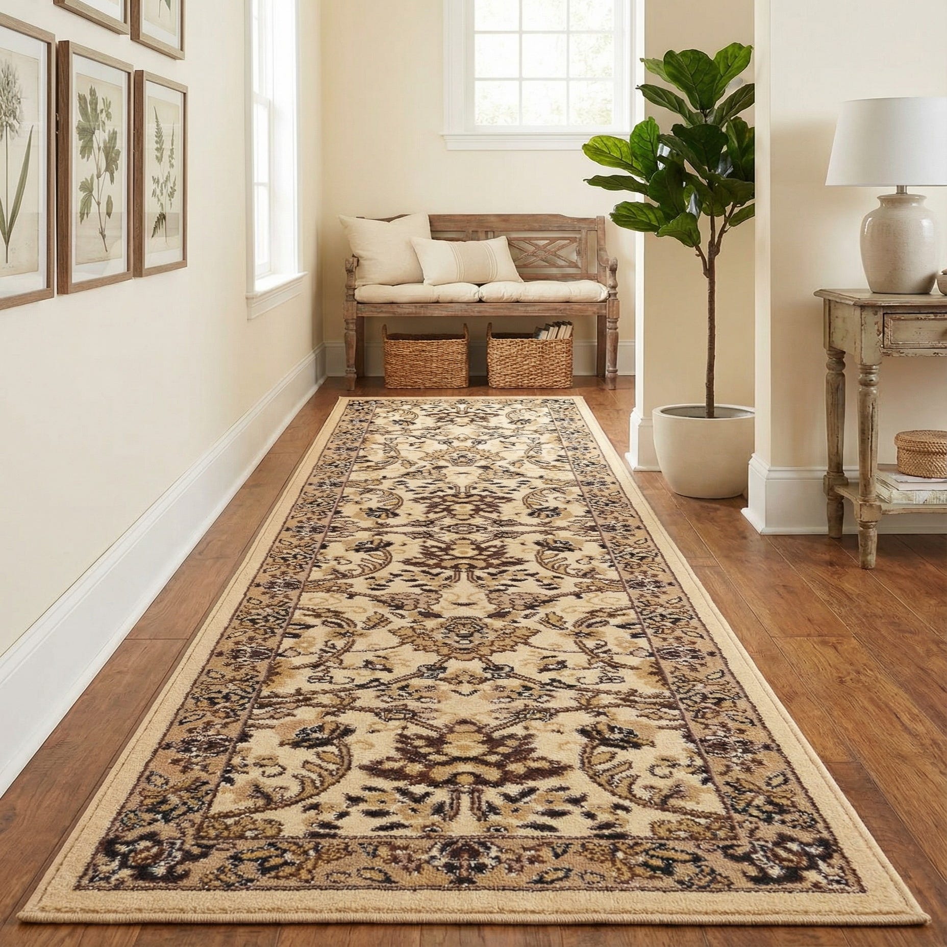Designed for long, narrow spaces, this runner works well in a foyer or entry hall to set a welcoming tone, along a corridor to add visual interest, or between kitchen cabinets and an island to warm tile or hardwood floors. It pairs particularly well with warm wood tones, cream or tan upholstery, and traditional or transitional furnishings—use it to anchor a chair-and-console vignette, line stair treads for a coordinated look, or add a refined touch to a classic dining-service pathway.