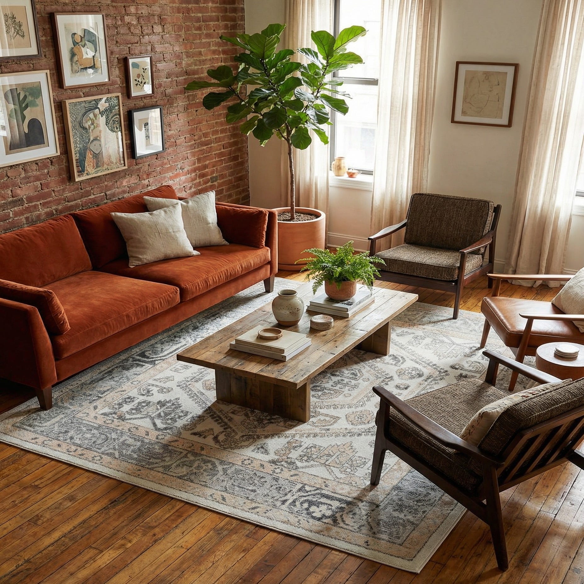 Use this square rug to anchor a seating group in a living room, center a square dining table, or add a layered, grounded look beneath a bed in a guest or master bedroom. It pairs well with light-wood or painted furniture, linen upholstery, and metal accents for a balanced transitional, modern farmhouse, Scandinavian, or contemporary-traditional interior.