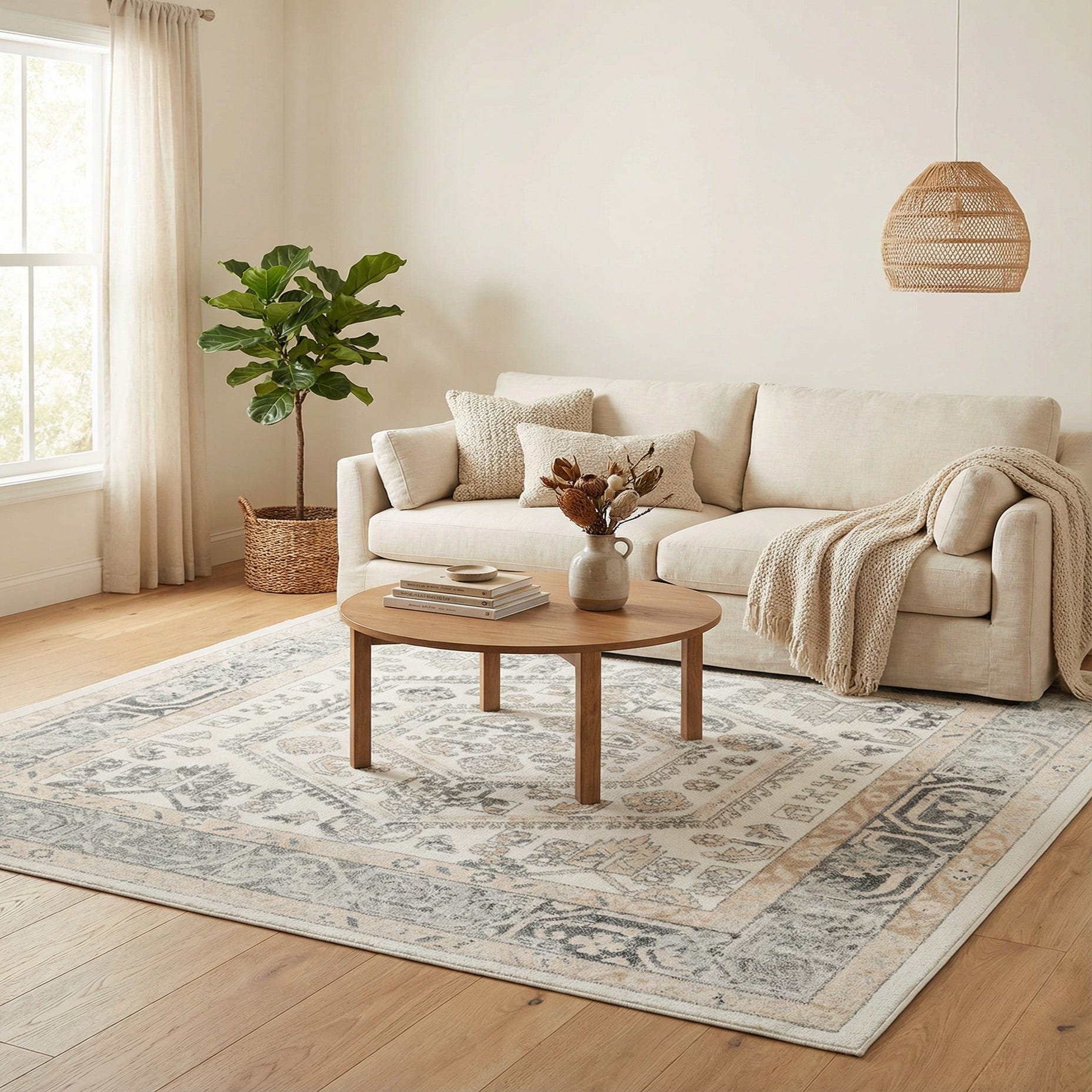 A muted, vintage-inspired medallion and border pattern sits on an ivory ground, rendered in soft gray, warm beige and touches of black for subtle contrast. The design reads as gently distressed, with traditional motifs that give the rug an aged, collected look without heavy contrast. Machine made of 100% polypropylene, the construction yields a low-profile pile with a smooth, slightly cushioned hand you can feel underfoot and a finely detailed surface that holds the pattern clearly.