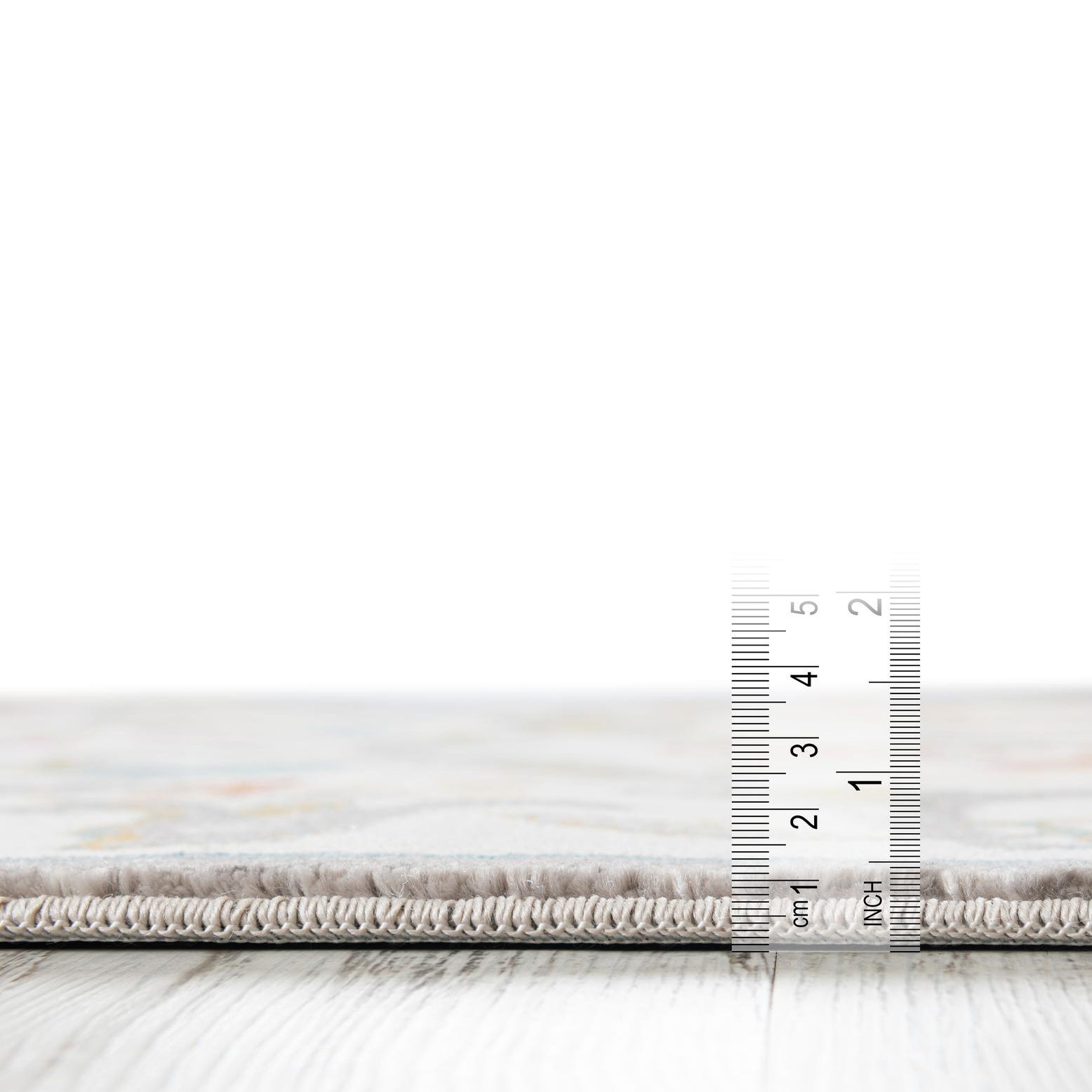 Primary color is Ivory. Colors in this rug include: Ivory, Blue, Burgundy, Gray, Green, Light Brown, Yellow, Pink.