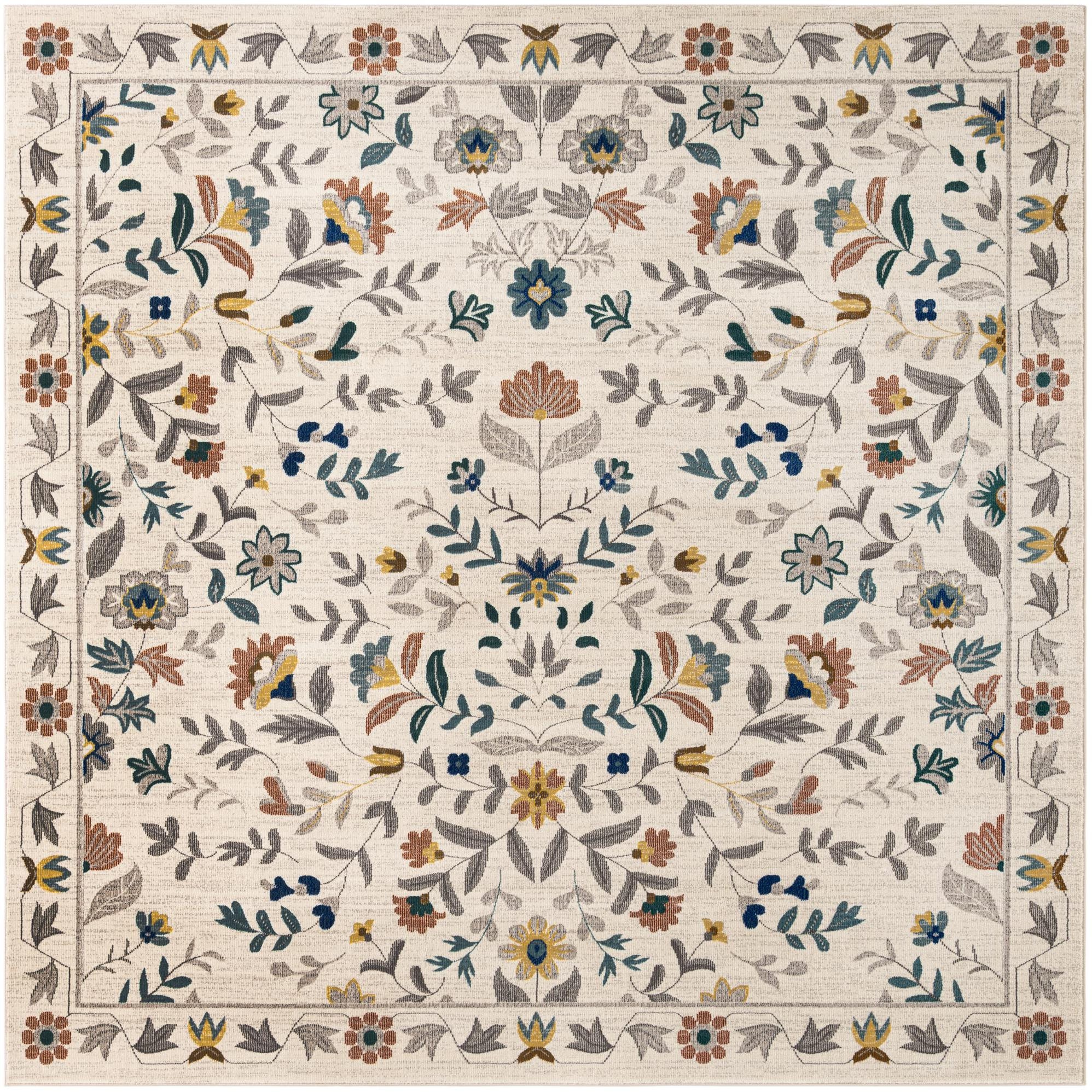 A square ivory rug with a detailed floral pattern in muted blues, greens, rust, and gold, featuring a decorative border.
