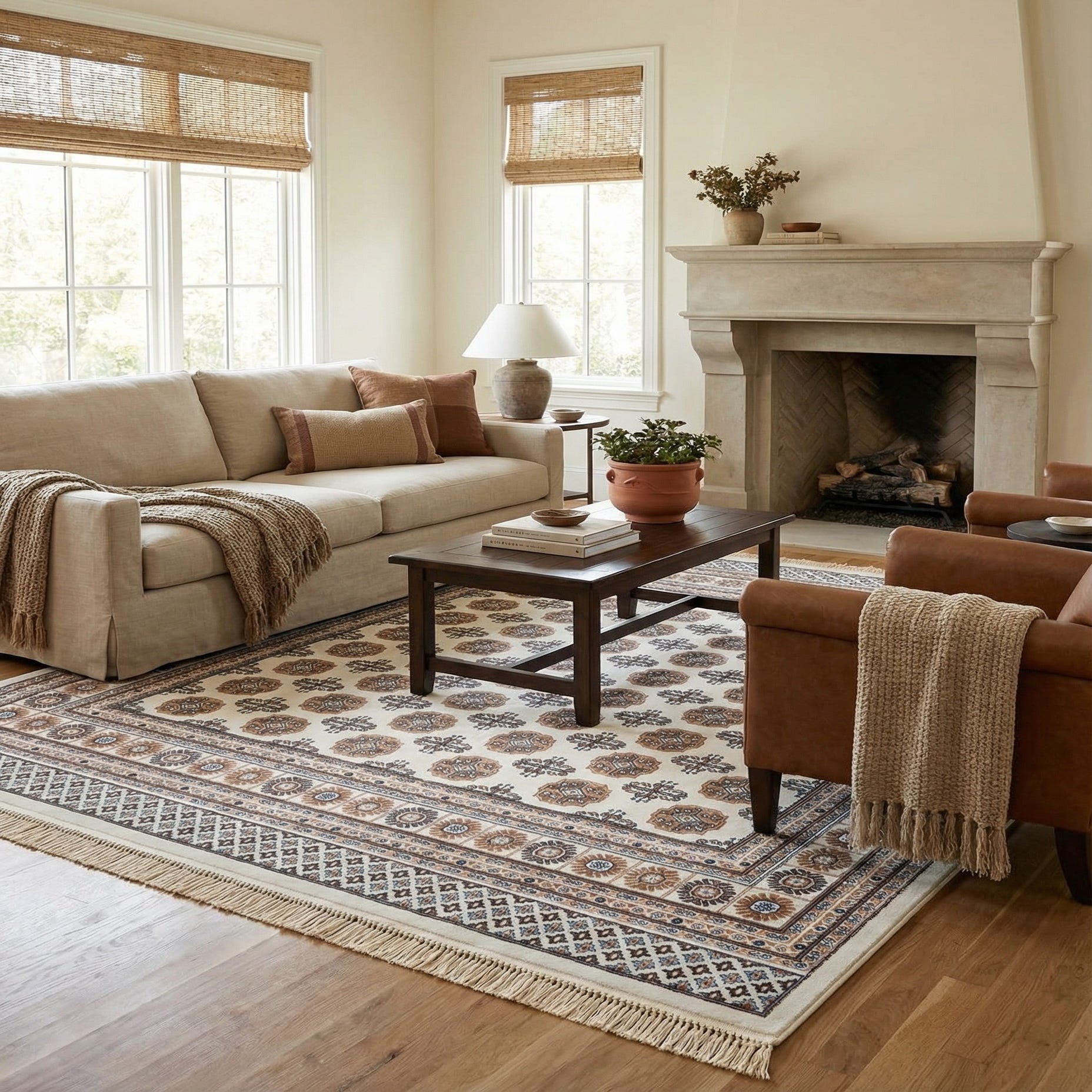 A square ivory and cream rug with a repeating pattern of brown and black floral medallions, bordered by intricate geometric designs and short fringe.