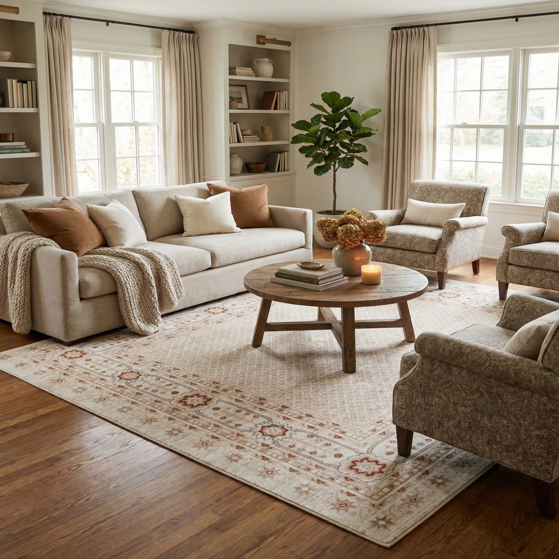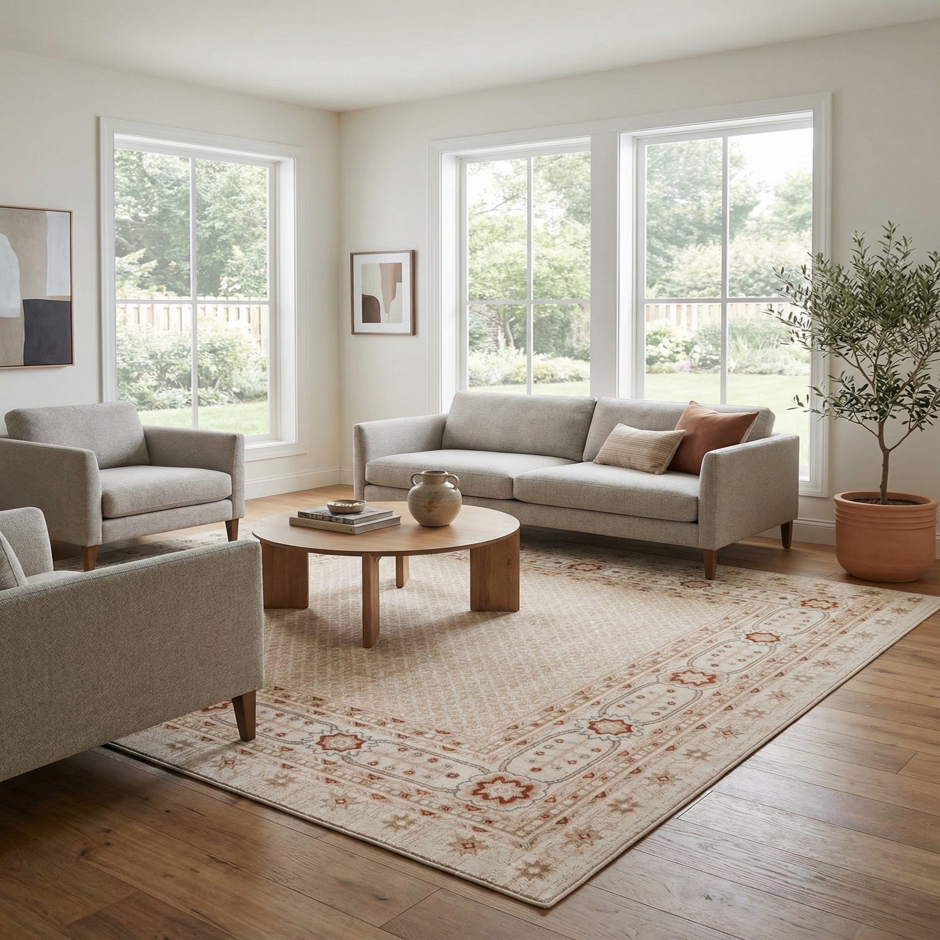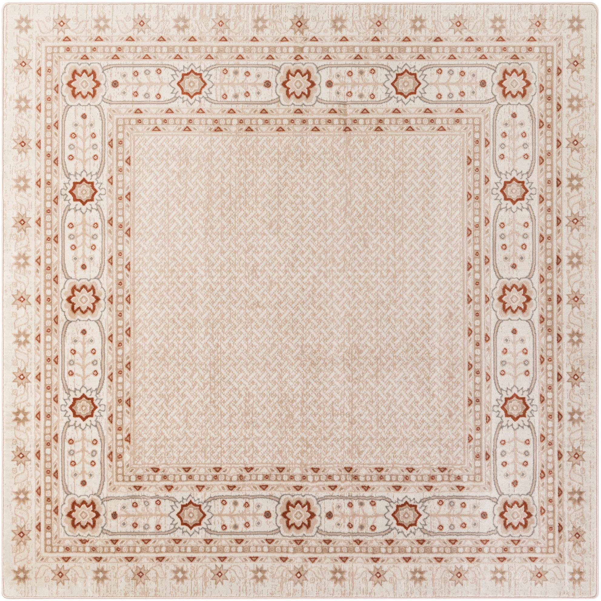 A square ivory and cream modern area rug with a detailed border featuring floral and geometric patterns in muted rust and gray tones.