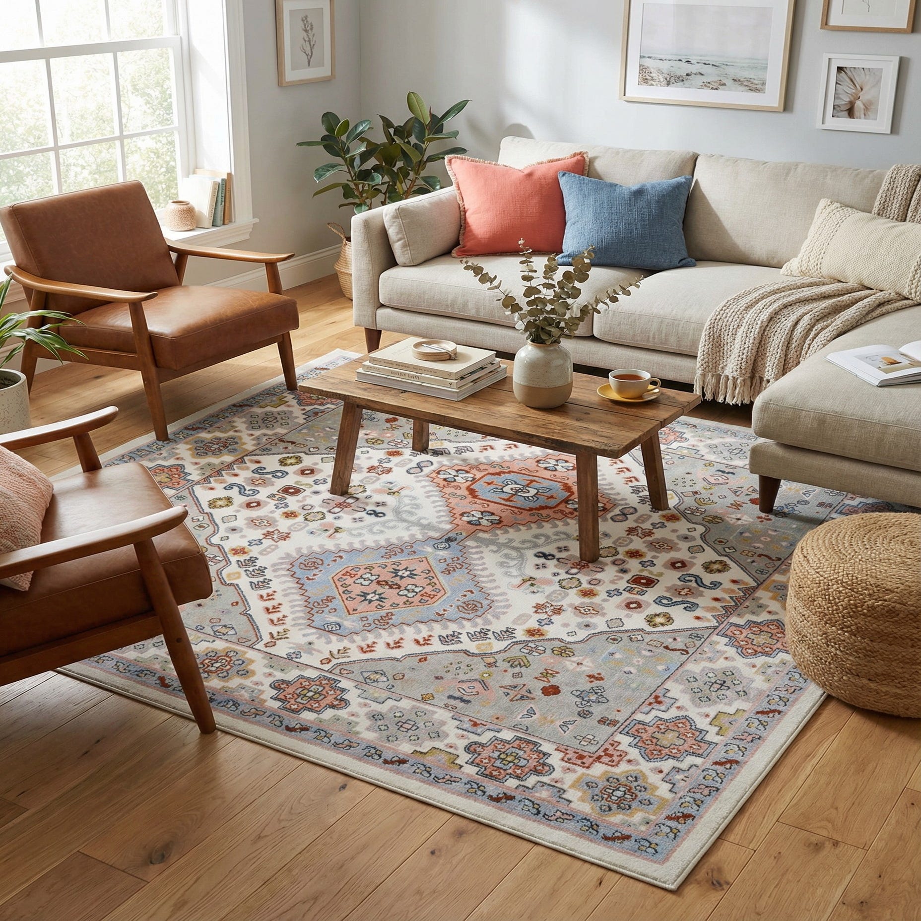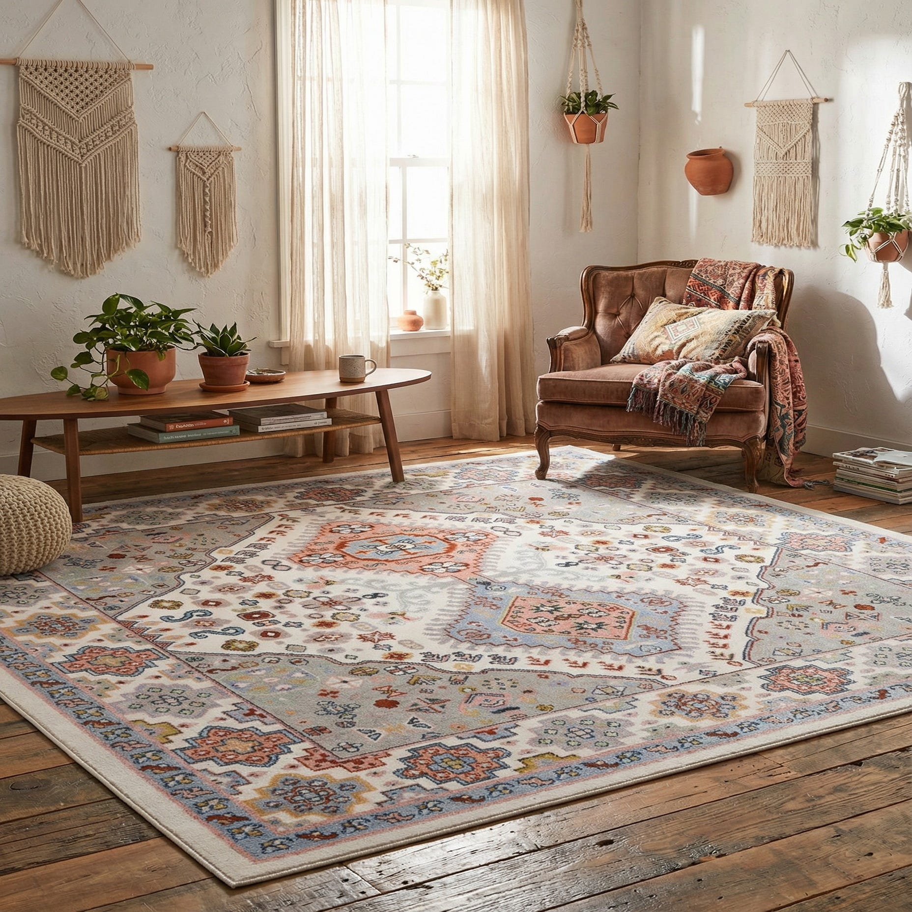 Primary color is Ivory. Colors in this rug include: Ivory, Gray, Green, Light Blue, Terracotta, Pink.