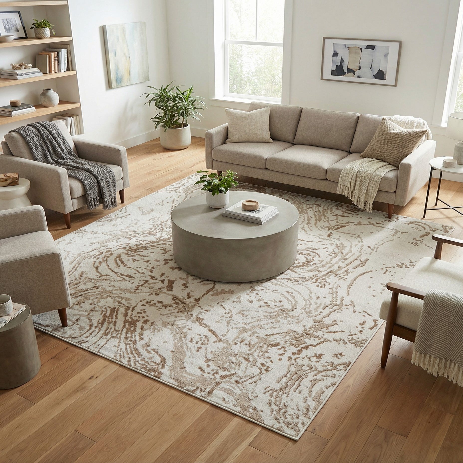 The calm, neutral palette and natural pattern fit a range of interiors — from contemporary living rooms and serene bedrooms to transitional dining areas. Pair it with light woods and linen upholstery for a coastal or Scandinavian look, or use it beneath a streamlined sofa and glass coffee table to introduce warmth and visual interest without competing with existing textiles. Its balanced design makes it easy to center a seating arrangement, anchor an entryway, or soften an open-plan space.