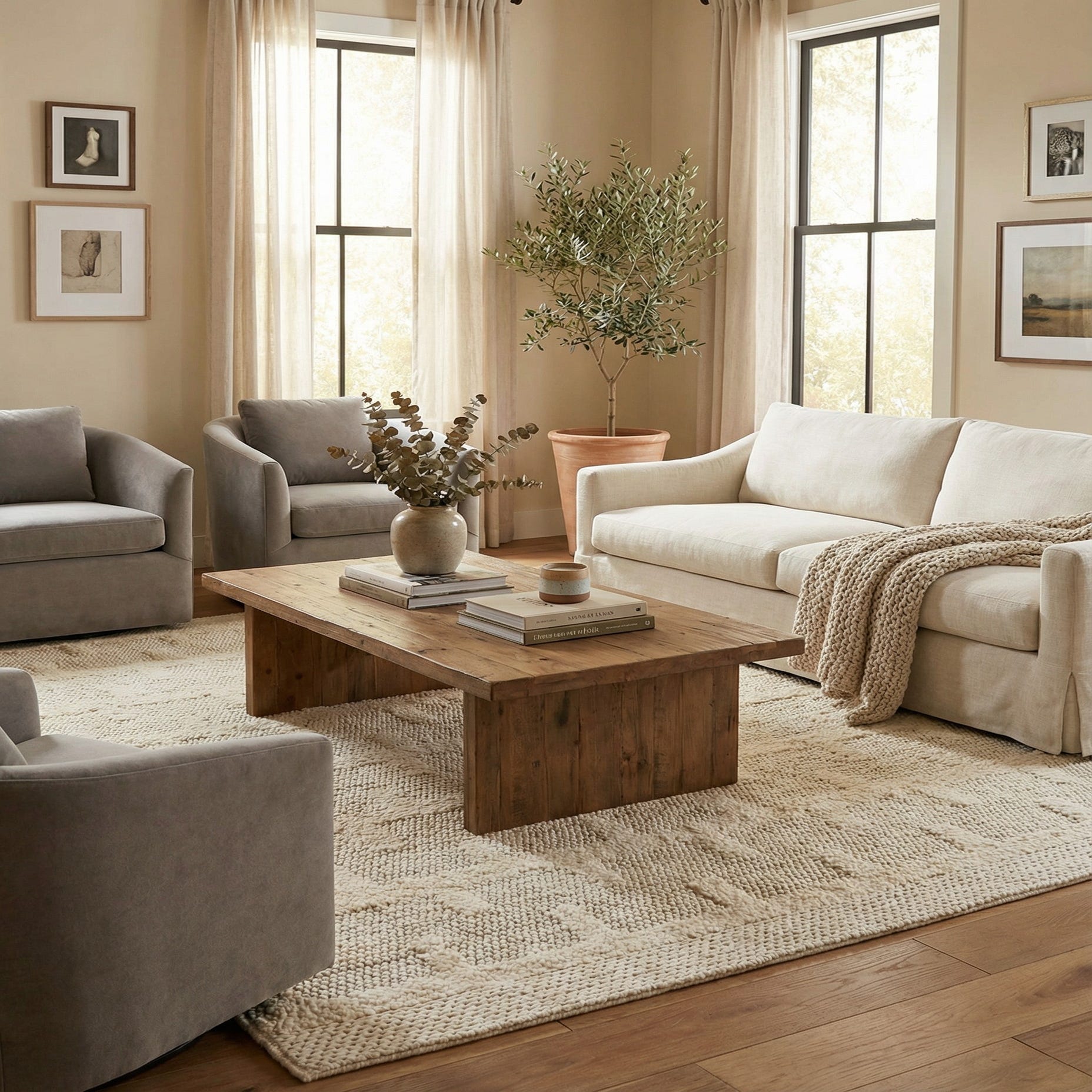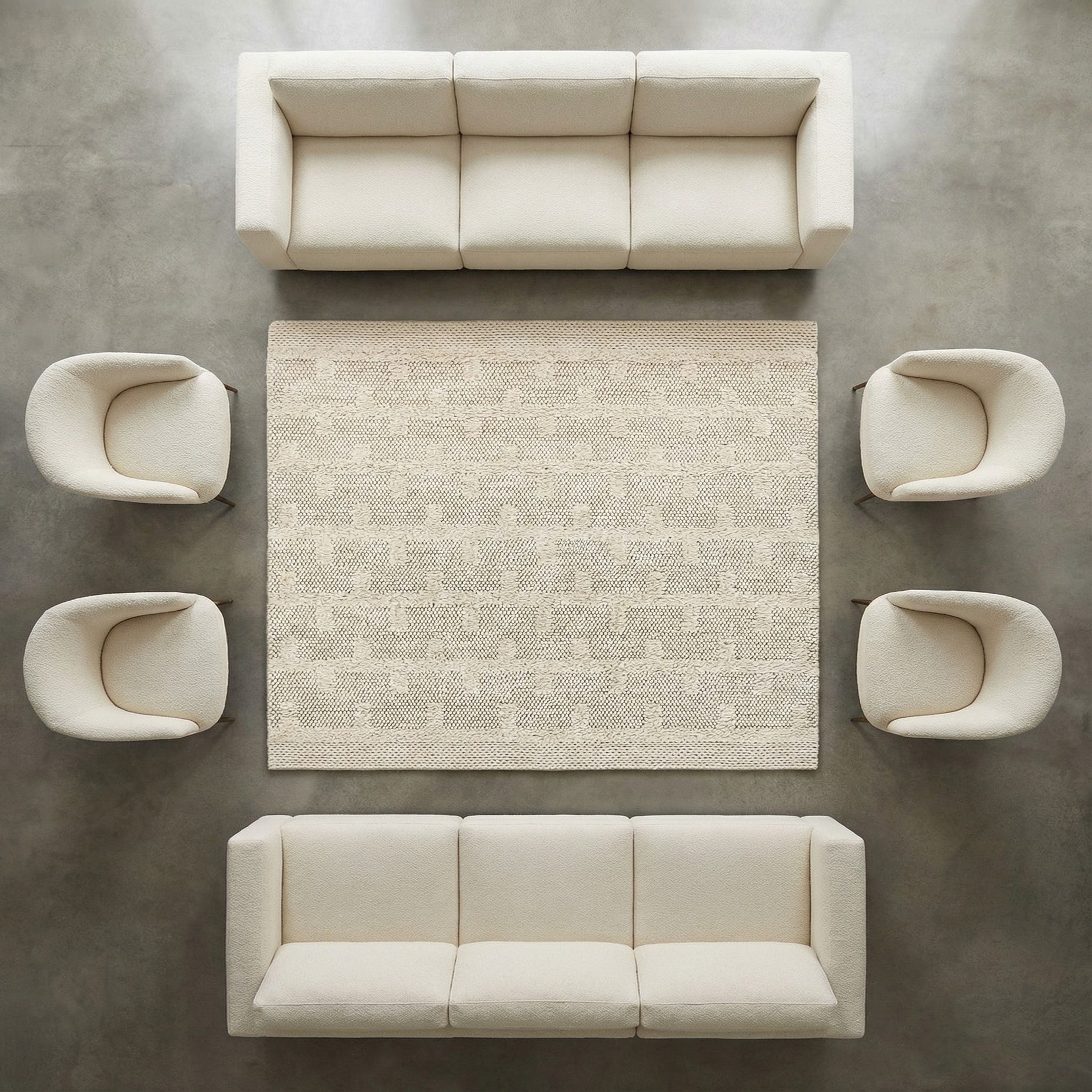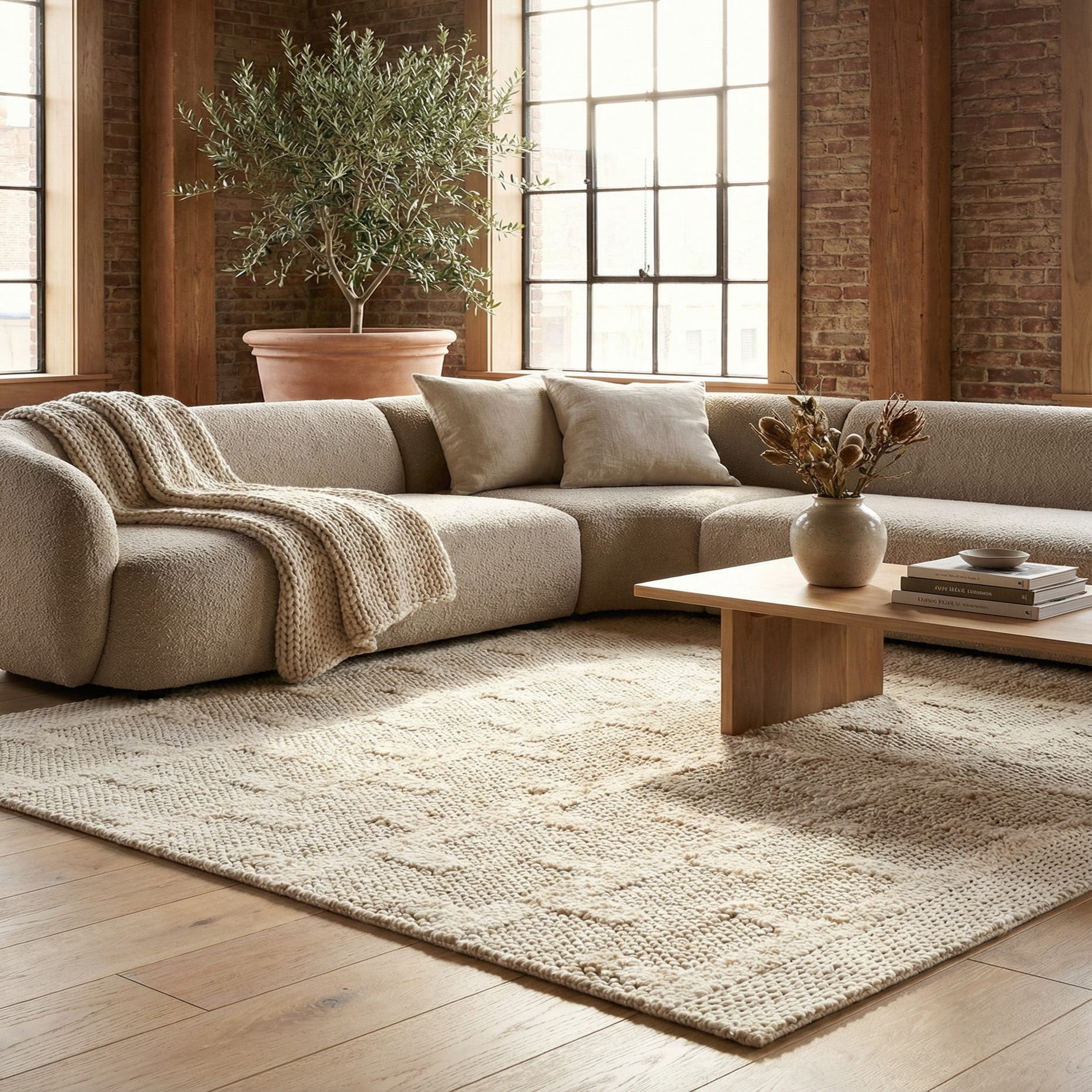 This rug works well as a grounding piece for a relaxed living room, layered beneath a low-profile sofa and coffee table to define conversation areas, or placed in a bedroom to soften hardwood floors and frame a bed. Its neutral ivory palette and tactile weave pair easily with warm wood tones, linen upholstery, woven rattan accents, and matte metal finishes, making it a good choice for Scandinavian, coastal, modern farmhouse, or transitional interiors that favor understated texture and a light, airy feel.