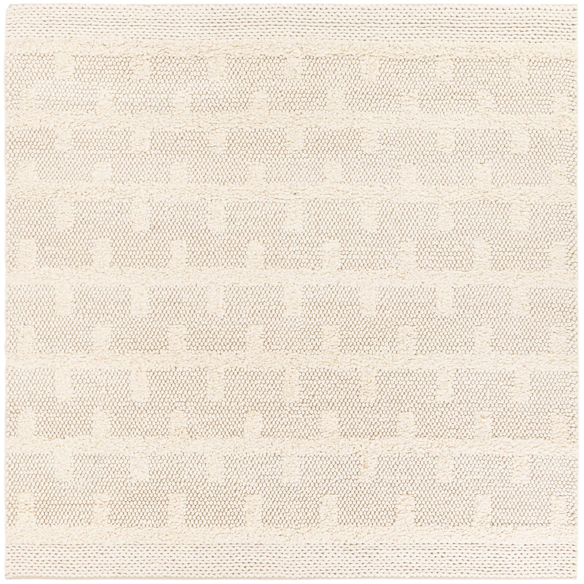 A soft ivory field sets a calm, neutral stage for a low-contrast geometric motif formed by alternating flat weave and raised looped rows. The pattern reads as a subtle grid of short tufted bars and horizontal bands, giving the surface a gentle rhythm without strong color contrast. Hand-woven and composed of 70% wool, the rug has a warm, slightly nubby hand — plush where the loops lift and more structured where the weave lies flat — so it feels comfortable underfoot while offering visible texture that catches light differently across the surface.