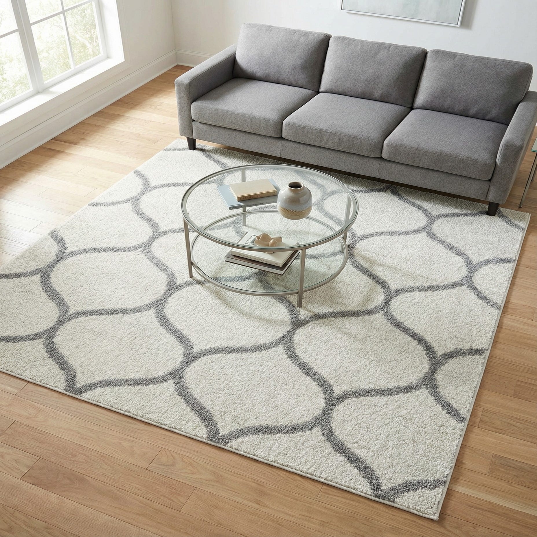 Run your hand across the rug and the subtly sculpted lines register as a low, tactile relief against the ivory field, giving both visual and textural interest. This piece works well layered over hardwood or pale tile to warm a living area, anchored beneath a sofa and coffee table in a transitional family room, or placed under a bed to add softness and pattern to a serene bedroom. It also pairs nicely with light woods, cool metal accents, and soft gray or pastel textiles for a calm, cohesive look.