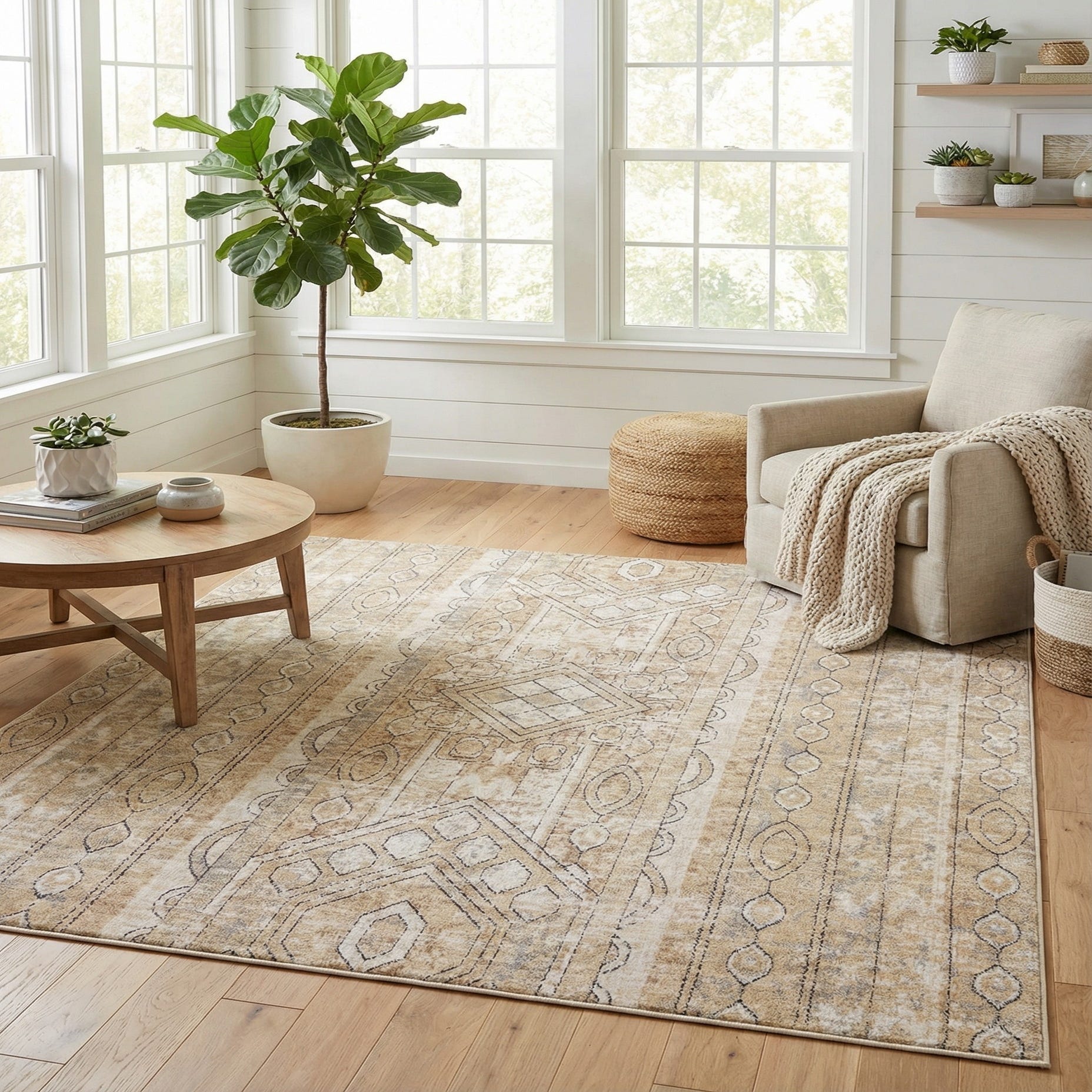 The neutral palette and understated textural detail make this rug an easy anchor for living rooms, layering under a sofa and coffee table to warm a seating area without overpowering other elements. It also fits well beneath a dining table in a casual dining room or anchored at the foot of a bed to add quiet pattern and softness underfoot. Pair it with natural wood tones, muted linens, and matte metal accents for a cohesive, lived-in look.