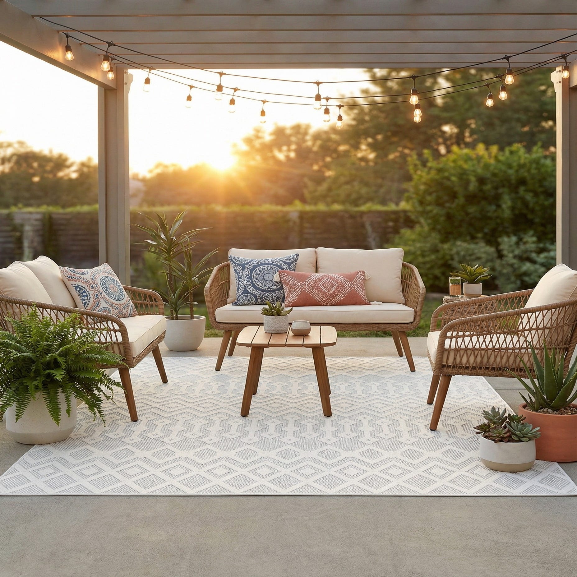 This rug would work wonderfully in outdoor leisure spaces such as patios, decks, and poolside areas. Its crisp pattern and neutral color can complement contemporary, coastal, or minimalist decor. The simplicity and functionality of the rug make it adaptable for various outdoor entertainment and relaxation scenarios.