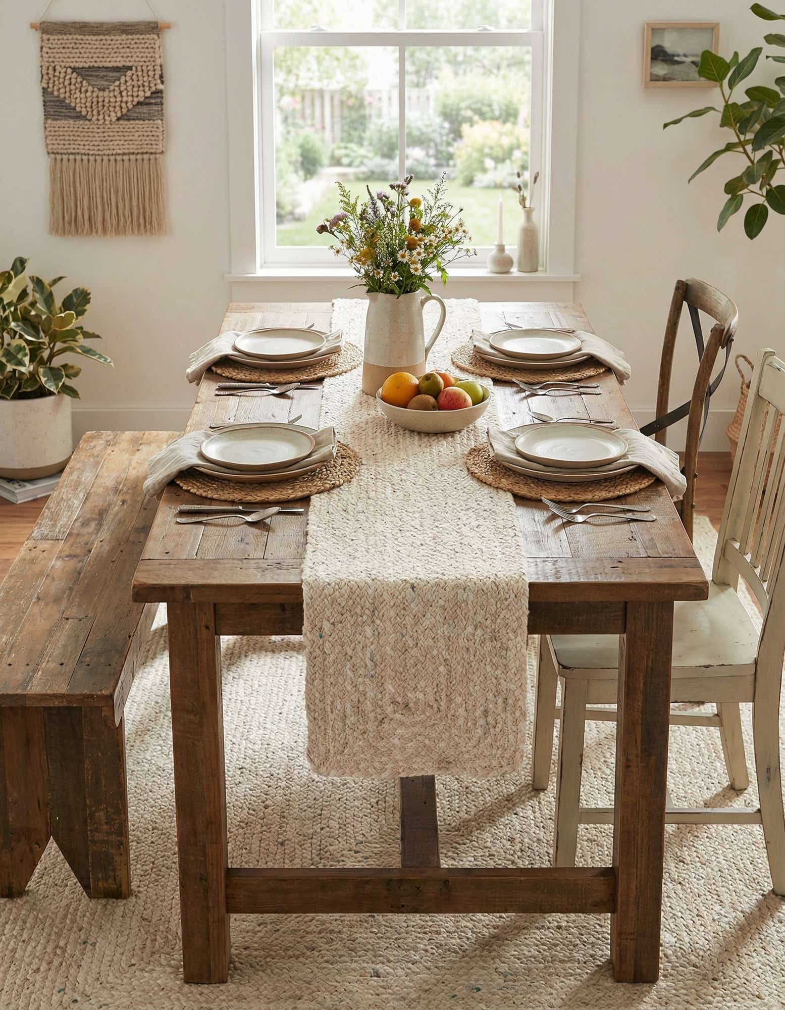 The natural cotton braid and low-profile texture suit relaxed, everyday settings as well as more curated tablescapes. Place it down the center of a farmhouse or coastal dining table, layer it over a linen tablecloth for a textured contrast, or use it on a console or buffet to soften a wood surface. Its neutral palette and simple braided pattern also work well in modern rustic and cottage-style interiors, where tactile, handcrafted pieces pair with mixed materials.