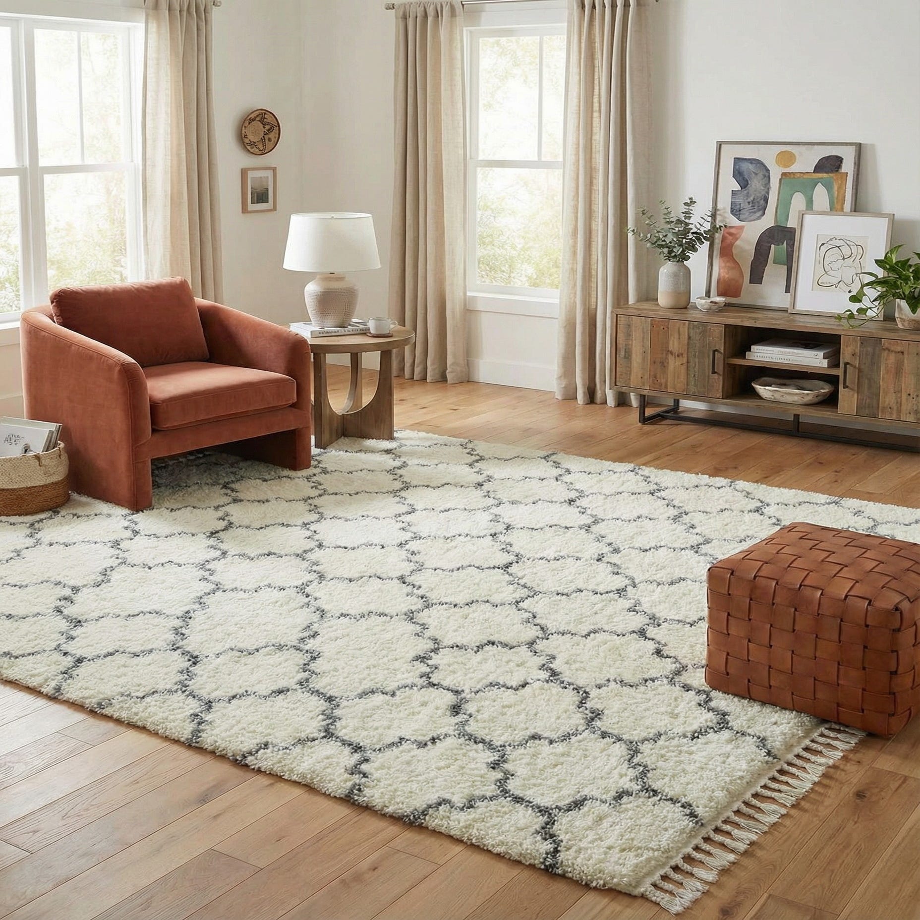 This rug works well as an anchor for a seating area in a living room, layered under a coffee table, or placed beside the bed to add a cozy step in the morning. Its neutral ivory and gray palette pairs easily with light woods and muted textiles for Scandinavian or coastal interiors, and it brings softness to contemporary and transitional schemes as well.