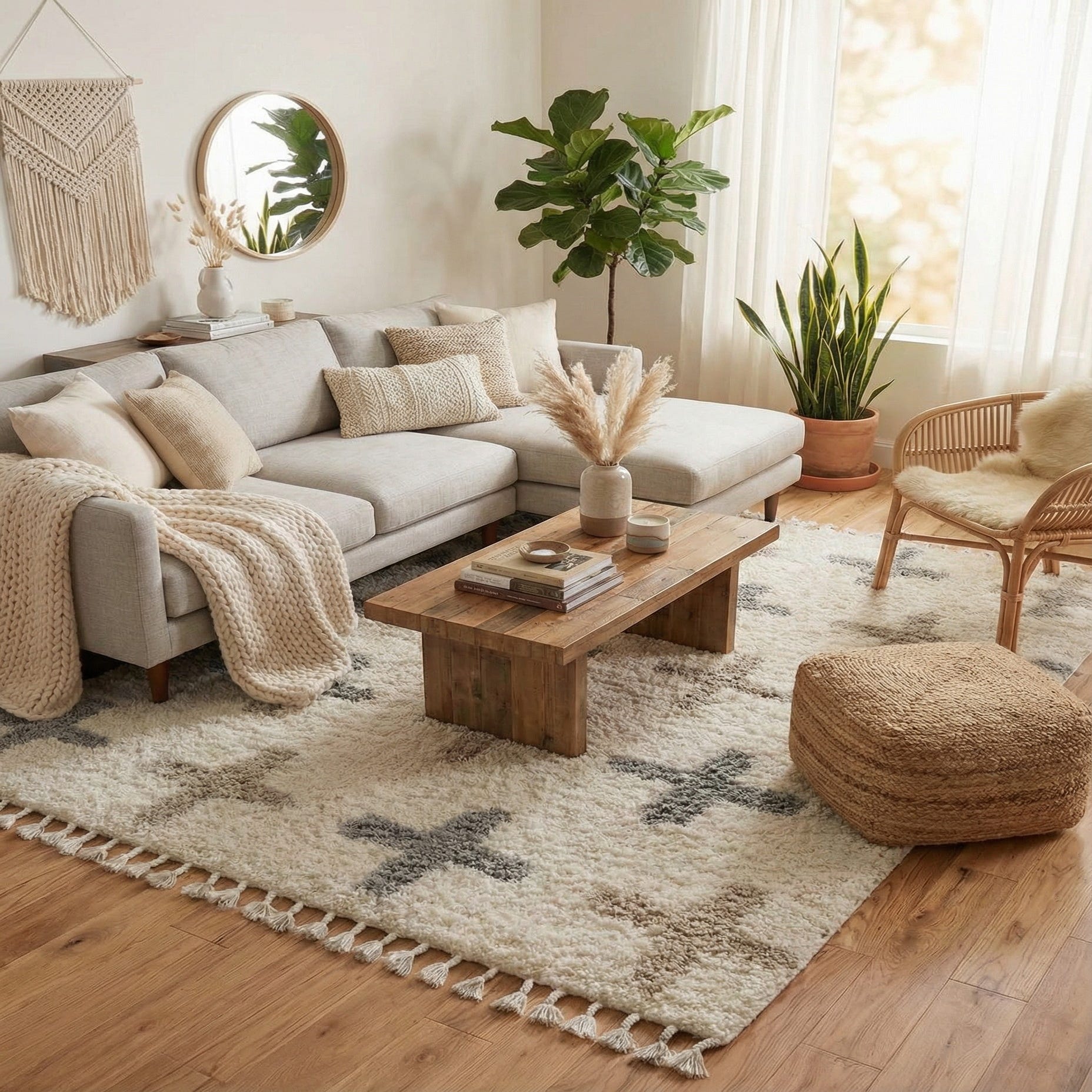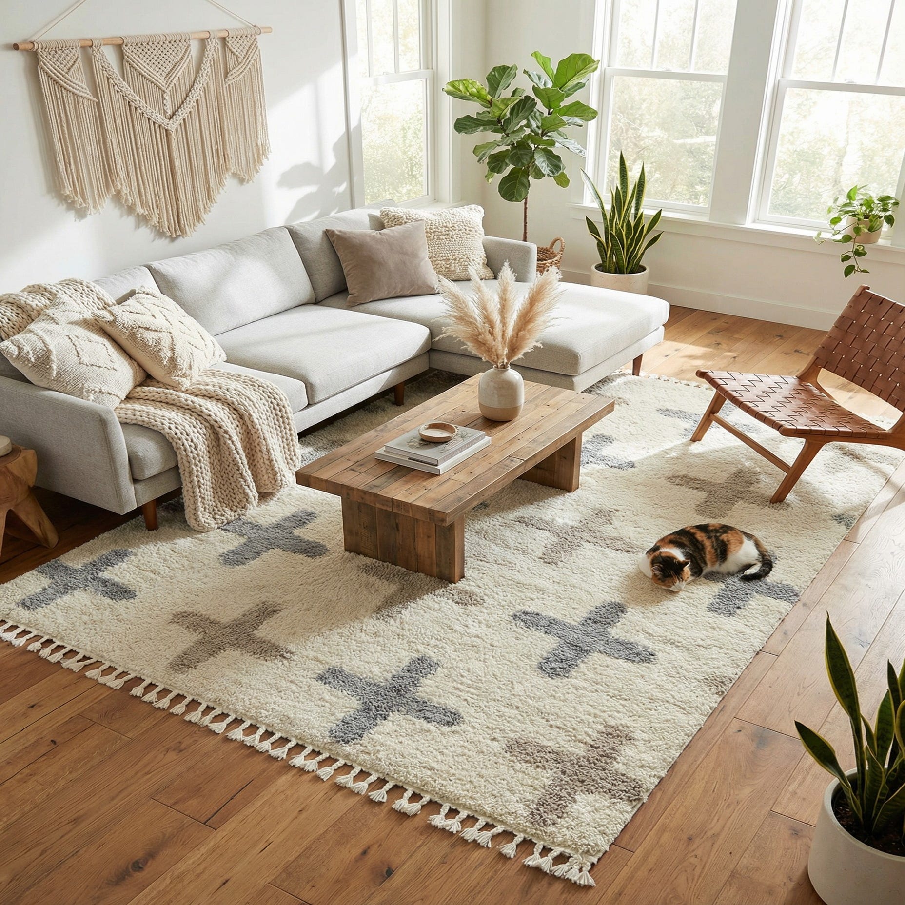 This rug pairs well with relaxed, modern interiors — think pale wood floors, linen upholstery, and simple, clean-lined furniture. It works equally well in a calming bedroom or nursery for added softness, or layered in a living room beneath a low-profile sofa and coffee table to define the seating area. The neutral palette also complements Scandinavian, transitional, and coastal schemes where texture and subtle pattern are used to create warmth without overwhelming the space.