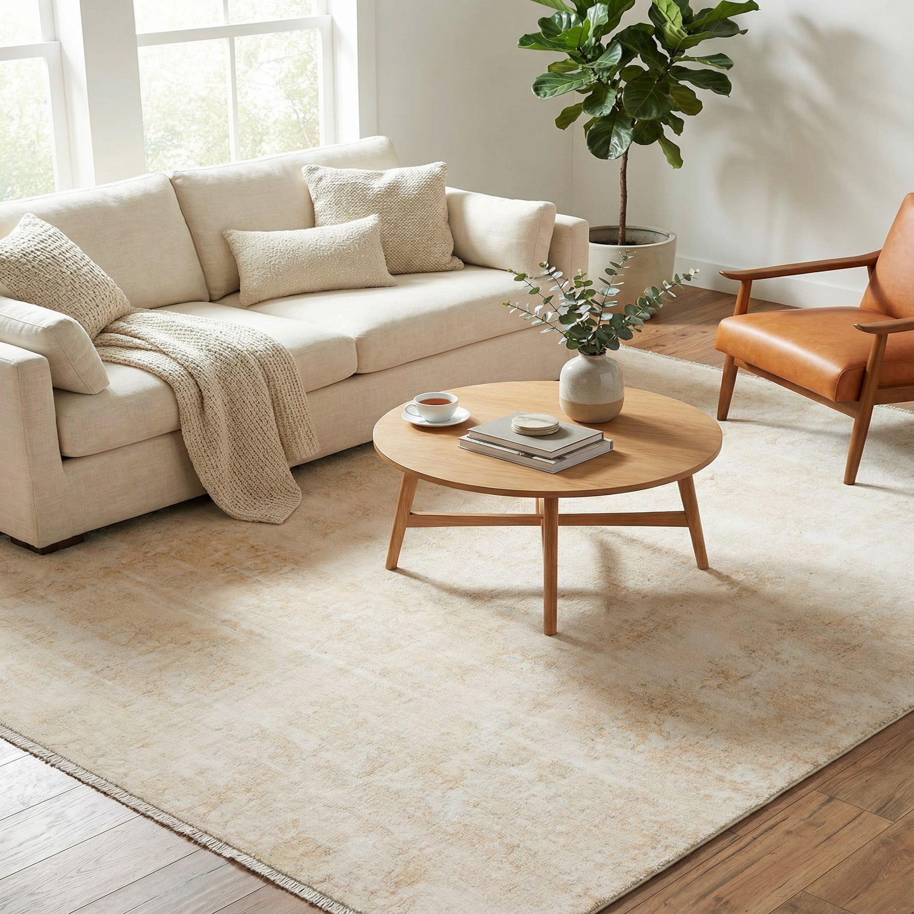 An 8x10 rectangular ivory and cream chenille rug with a subtle, faded pattern, perfect for a living room.