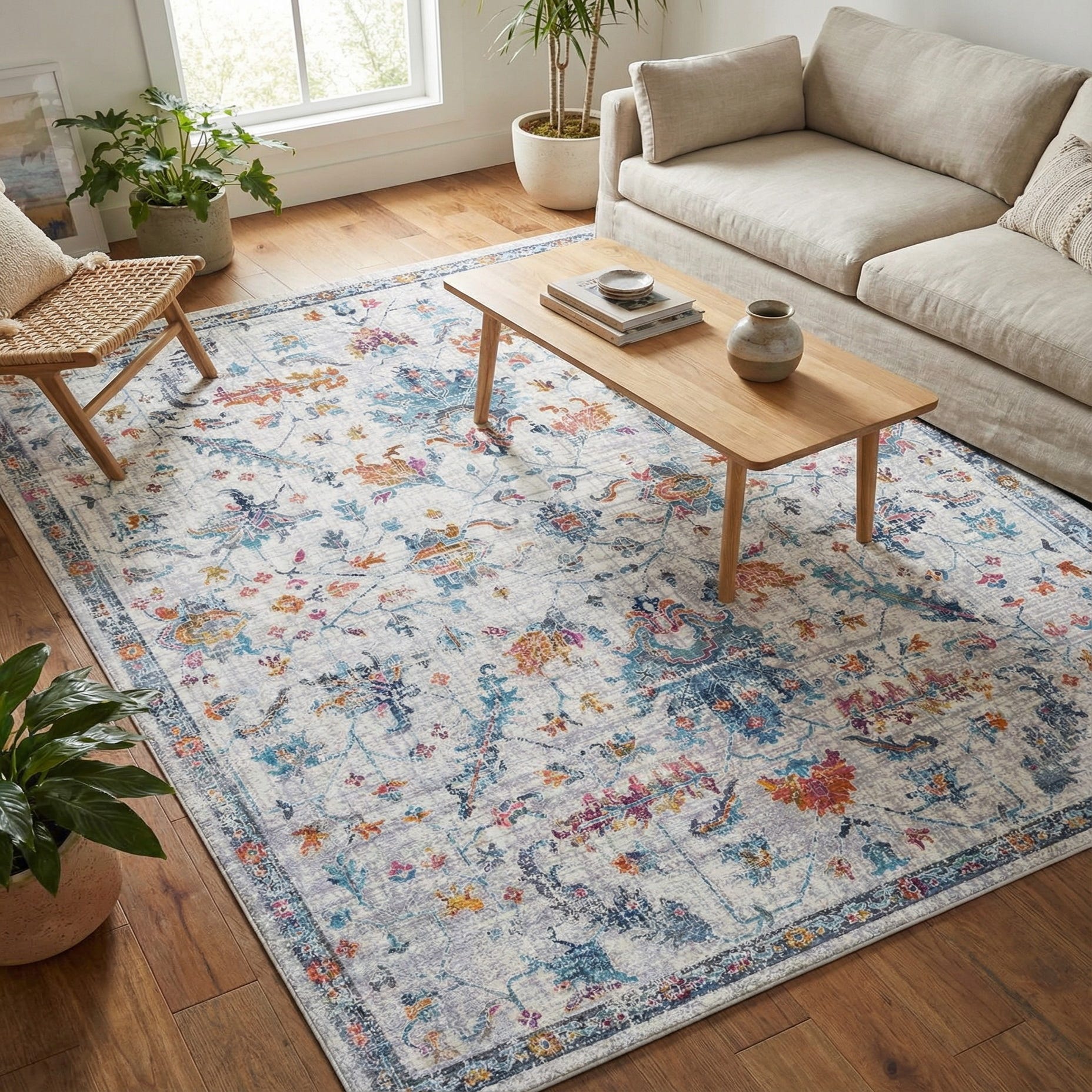 An ivory field sets a calm, neutral stage for a softly distressed traditional pattern of scrolling vines, floral medallions and delicate arabesques. Motifs in gold, gray, light blue and navy are punctuated with touches of violet and pink, creating a layered, lived-in look without heavy contrast. A narrow, faded border frames the design and reinforces the rug’s vintage-inspired character while keeping the overall feel light and airy.