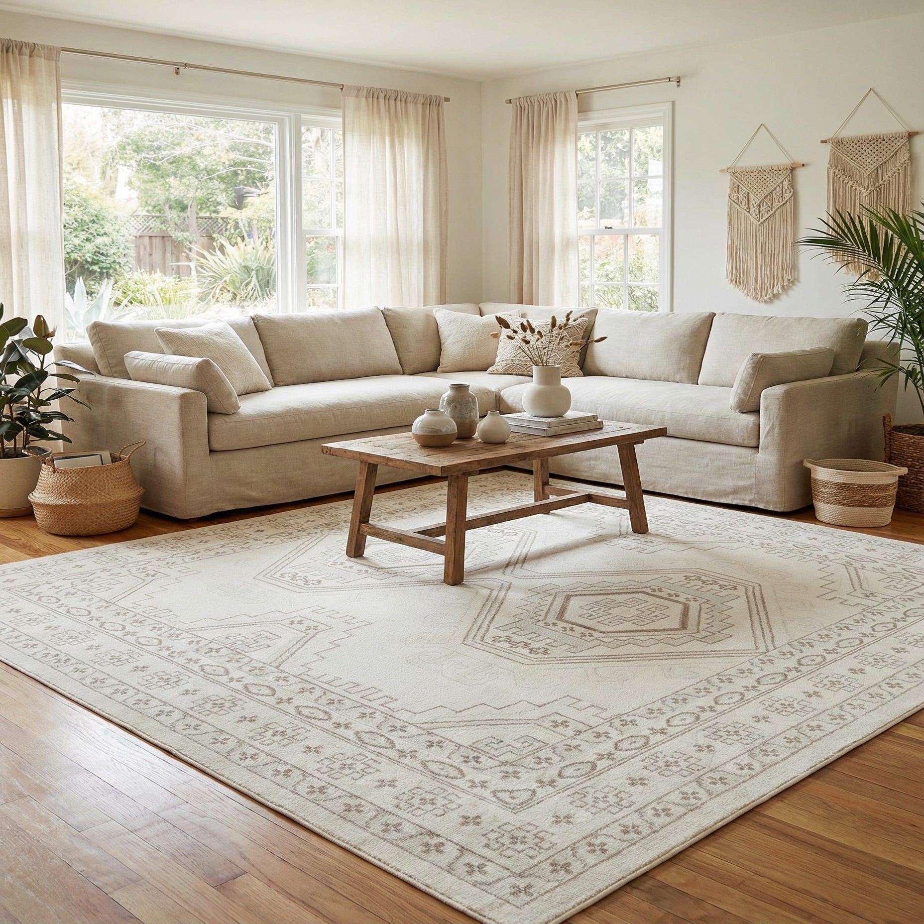 This neutral palette and structured pattern work well in a range of interiors: place it under a sofa and coffee table to warm a transitional living room, pair it with natural wood and linen in a bedroom for a relaxed, modern farmhouse feel, or use it to ground a minimalist dining area where muted tones and texture are key. It layers easily with textured throws and woven baskets, and complements both matte metal accents and warm wood finishes.