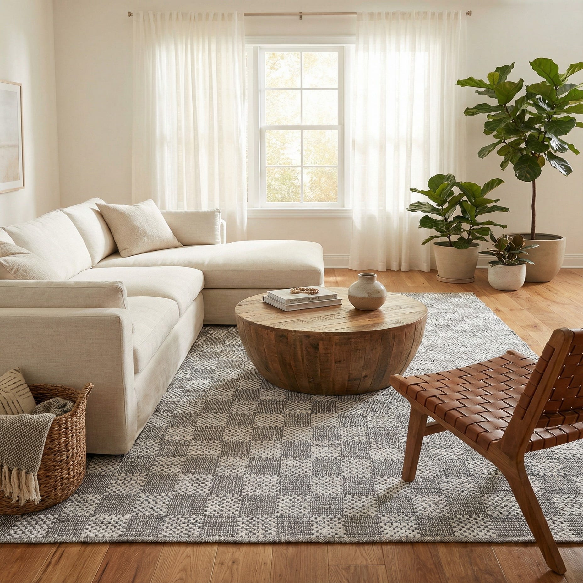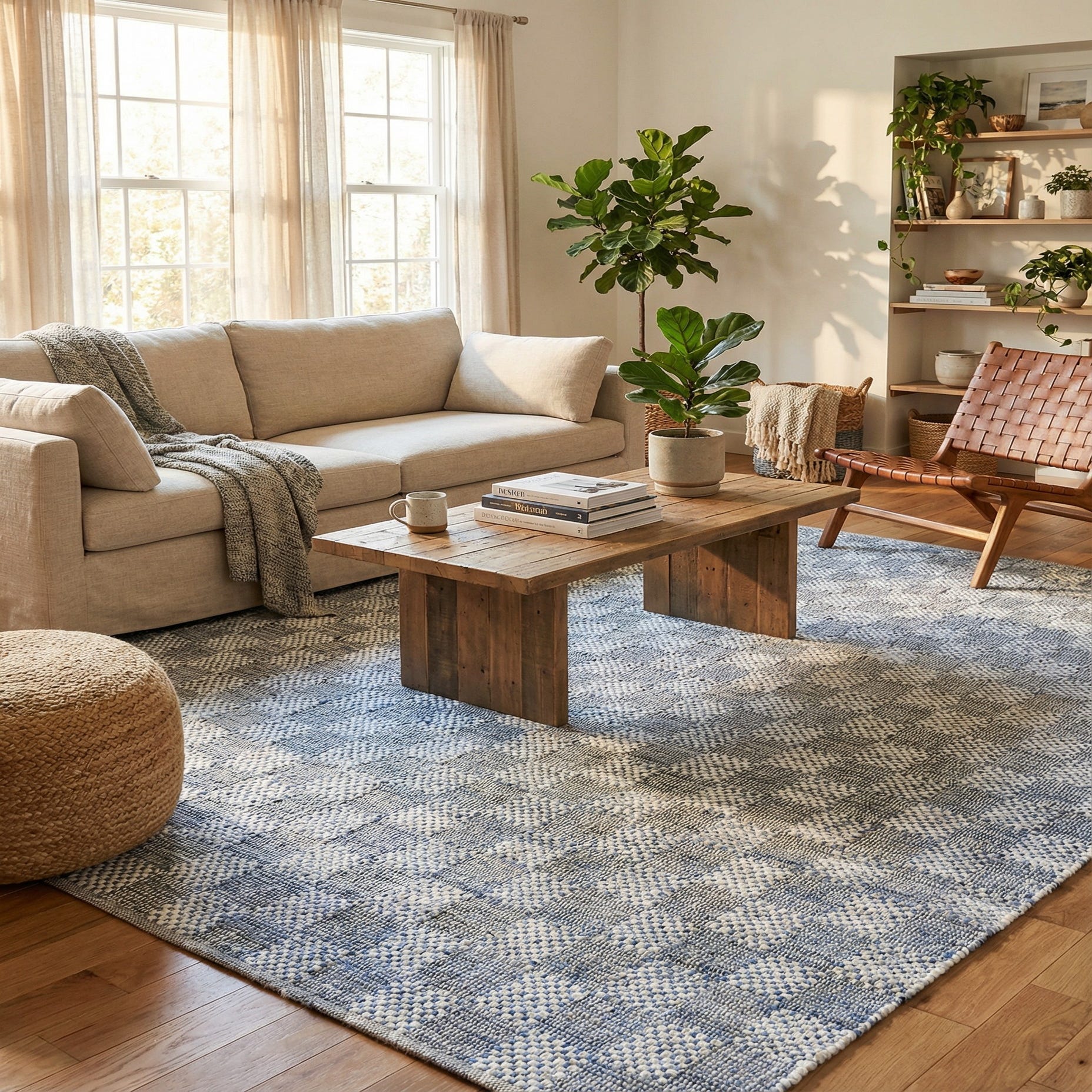 This rug works well to ground a neutral sofa grouping in a living room, sit beneath a natural-wood dining table to introduce pattern without overwhelming the setting, or add soft texture to a bedroom layered with light linens. It pairs naturally with Scandinavian, coastal, or modern farmhouse interiors — think pale woods, black metal accents, and soft gray upholstery for a cohesive, relaxed look.