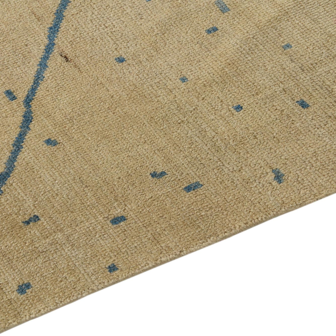 An 8x10 rectangular ivory wool rug with a high pile, featuring an abstract pattern of thin blue lines and small blue flecks.