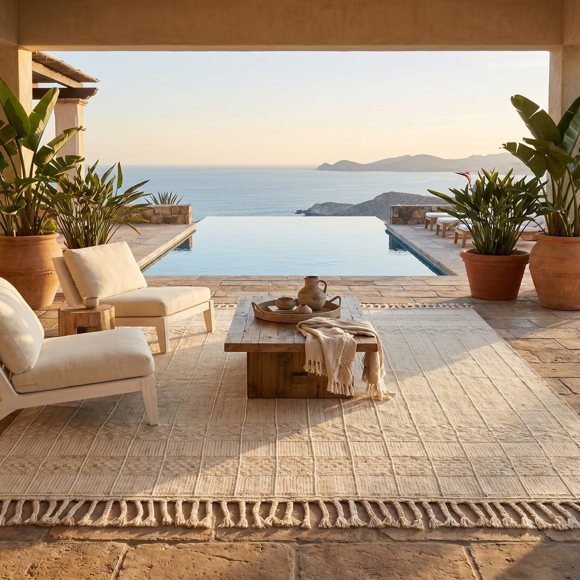 Absolutely love this rug. It doesn’t even seem like I should leave outdoors. It’s soft and comfortable to the touch not scratchy. The pattern is beautiful. We are extremely pleased.