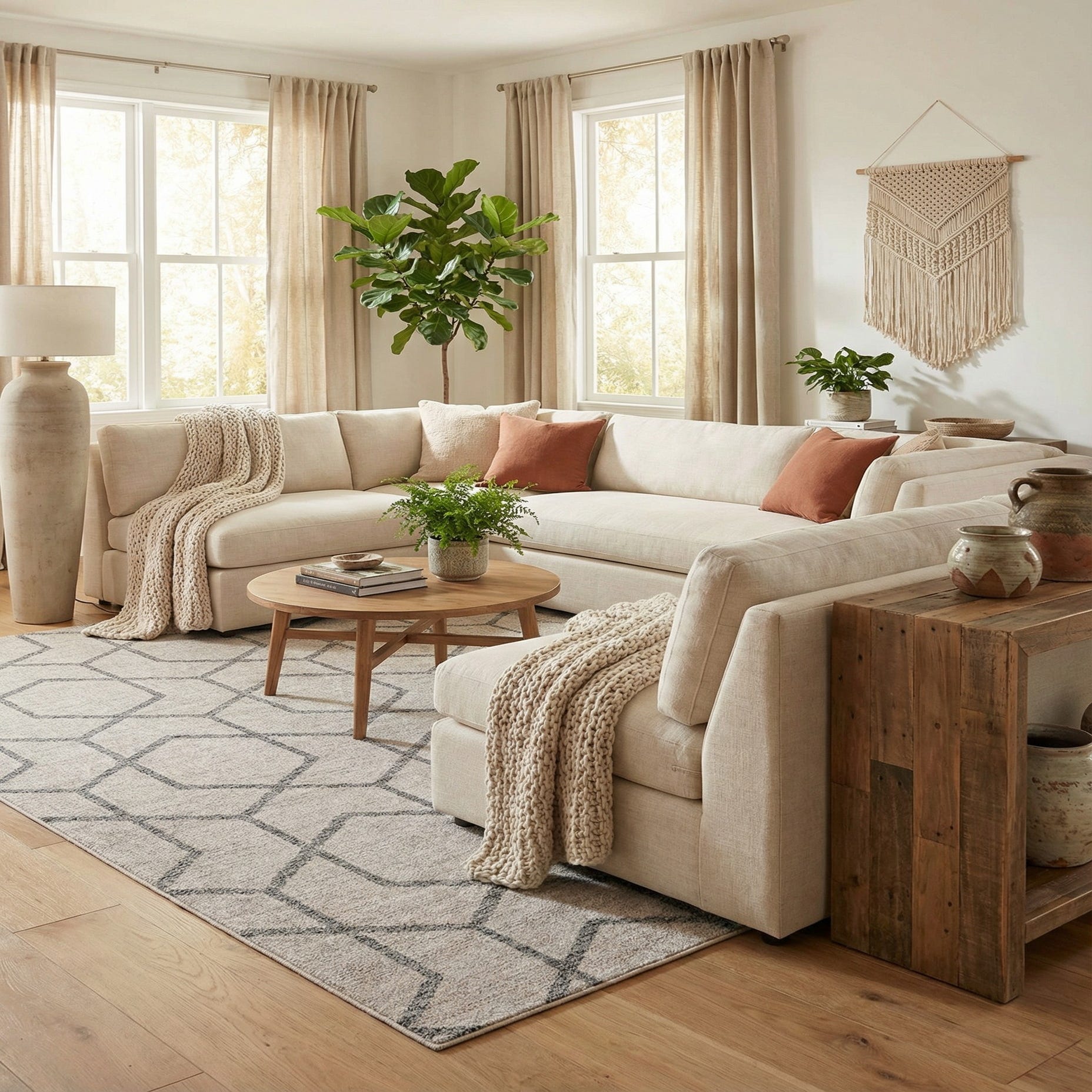 This pattern works well in contemporary and transitional interiors where you want subtle geometry rather than a bold statement. Place it under a coffee table in a living room with warm wood and black metal accents, anchor a bedroom with neutral linens and textured throws, or set it beneath a dining table to introduce pattern without competing with other finishes. It also pairs nicely with mid-century modern and Scandinavian furnishings, bringing balance to minimalist schemes or layering comfortably under more eclectic seating groups.