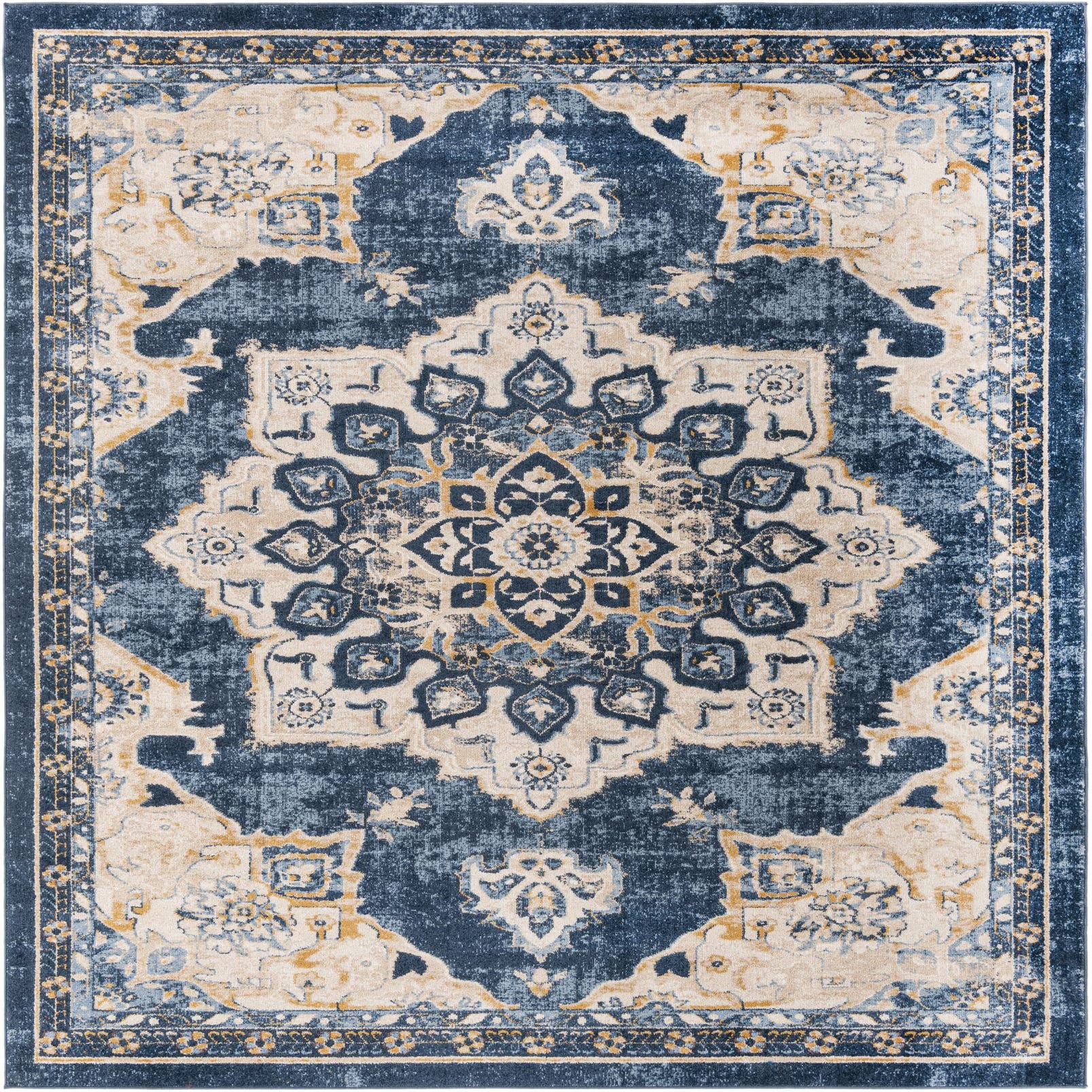 Primary color is Ivory. Colors in this rug include: Ivory, Blue, Beige, Navy Blue, Light Blue.
